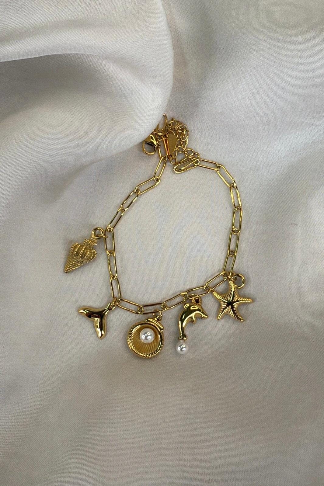 Forgyldt armbånd fra Molly&My Jewellery med vedhæng som delfin, stjerne, skal og hale på en kæde med ovale led.