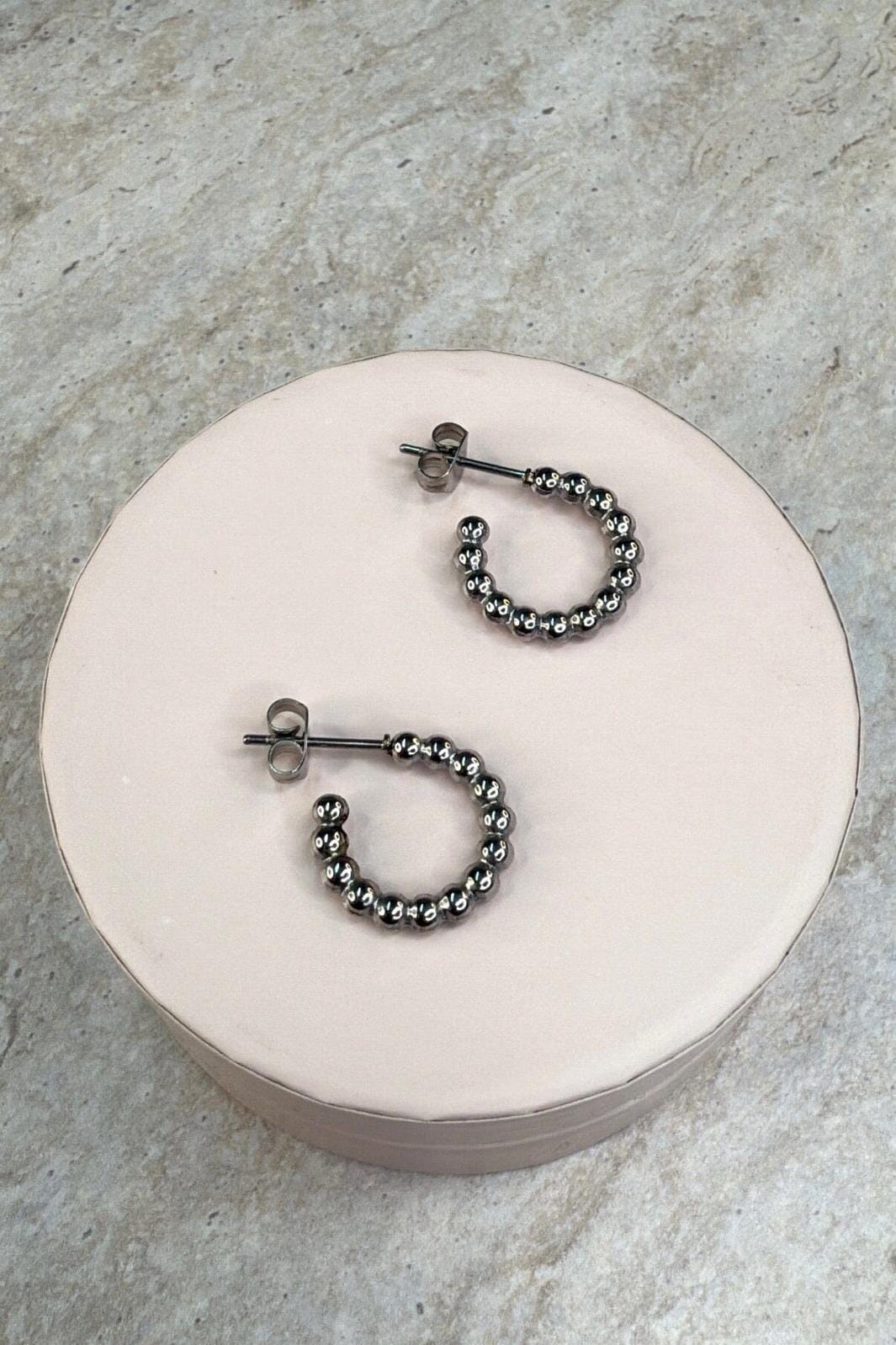Hoop-øreringe fra Molly&My Jewellery med et perlemønster. Små kugler danner en cirkelformet bøjle i sølv.
