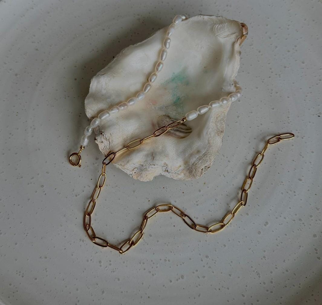 Halskæde fra Molly&My Jewellery x Melanie Due. Harmony kombinerer aflange paperclip-led i guldfarvet rustfrit stål med ovale skaller-perler i hvid og creme.