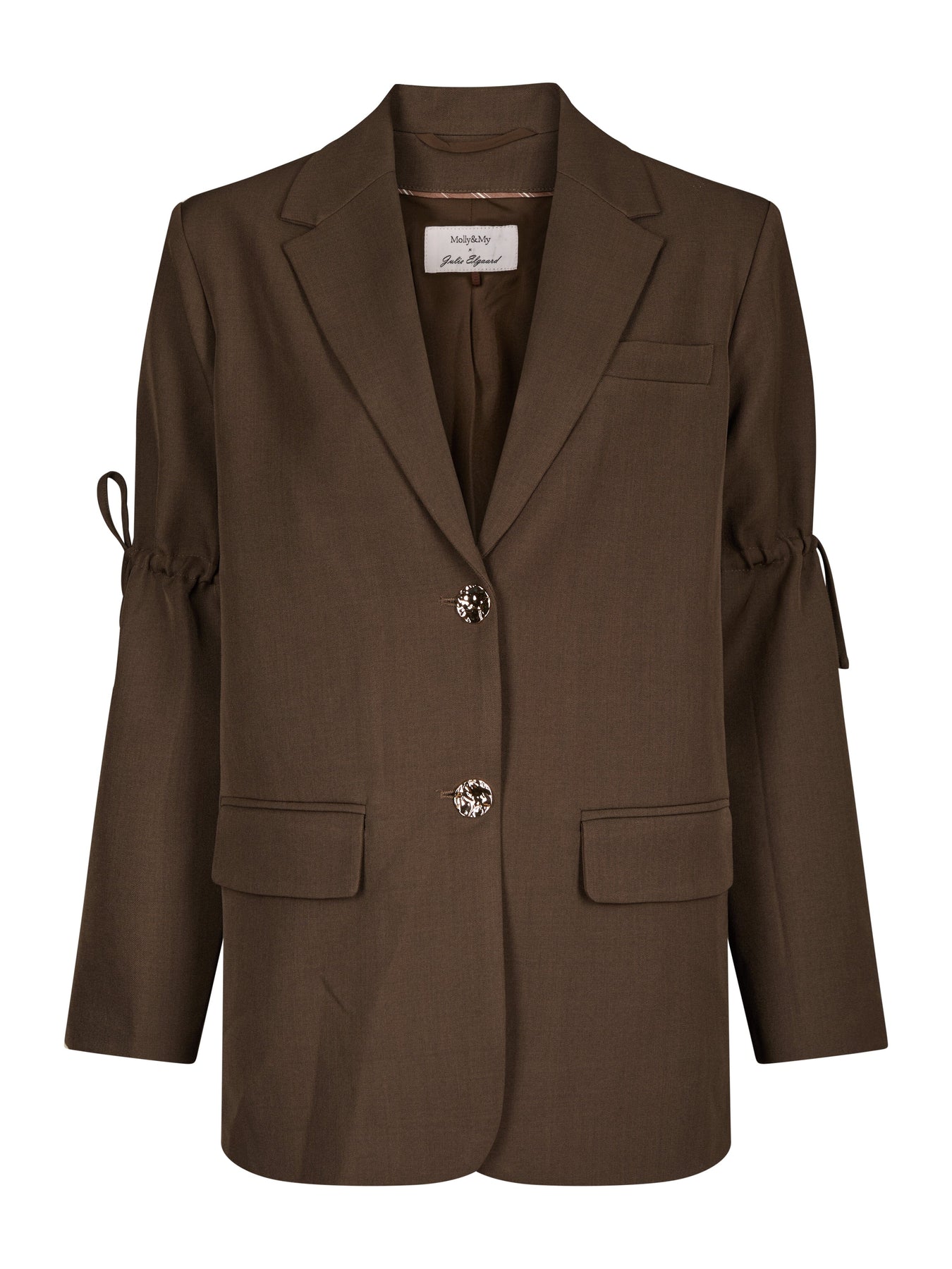 Mørkebrun blazer fra Molly&My x Julie Elgaard med snøredetaljer på ærmerne. Blazeren har en oversized pasform og V-hals.