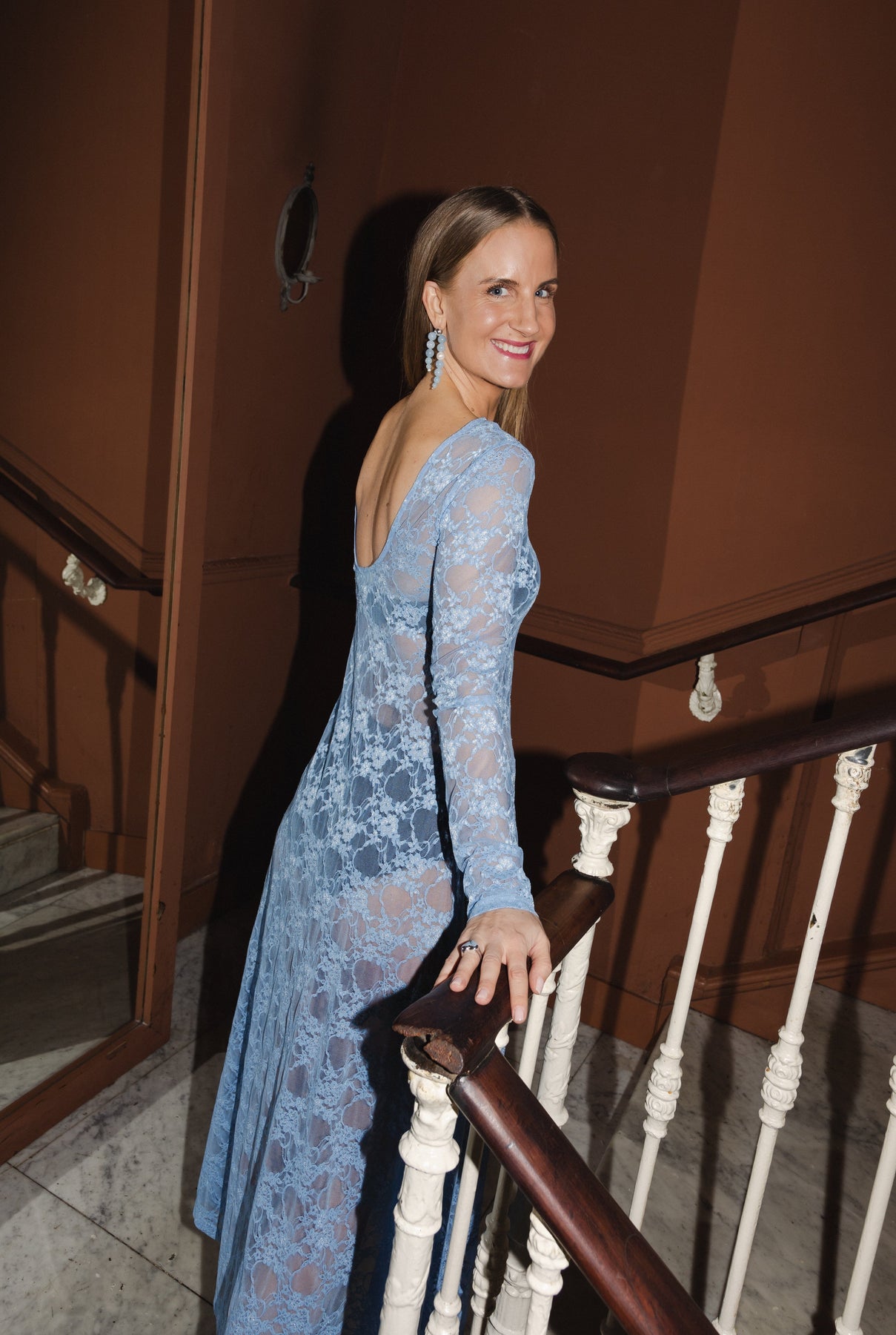 En kjole fra Molly&My x Julie Elsebeth i lyseblåt, gennemsigtigt blondestof med blomstermønster. Kjolen har lange ærmer og en dyb rygudskæring.