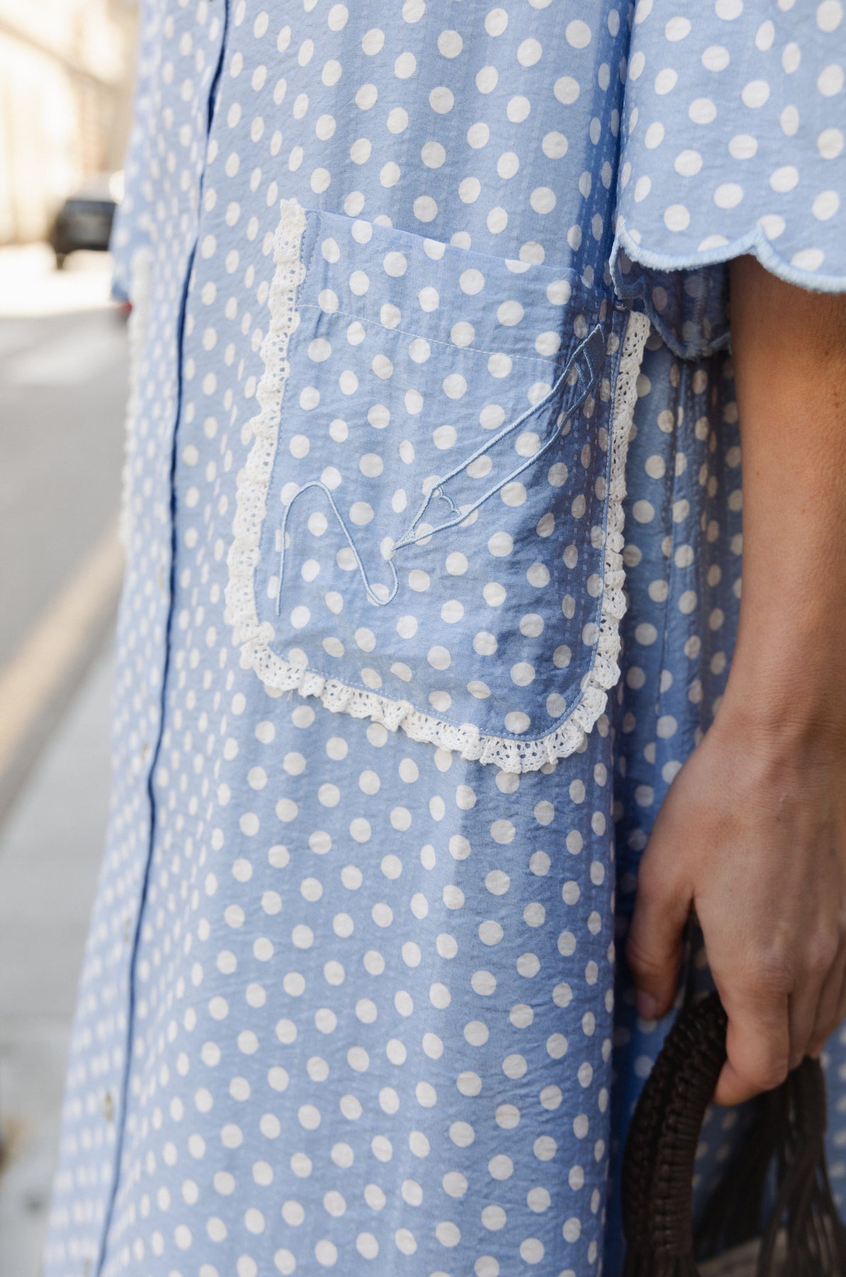 Kjole fra Molly&My x Julie Elsebeth med hvide polkaprikker på blå baggrund. Kjolen har dekorative syninger og blonder langs lommekanten.