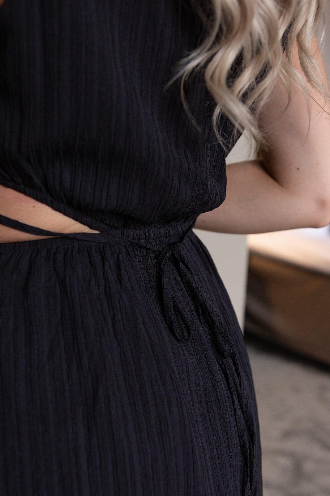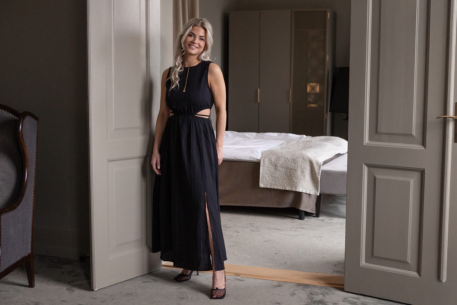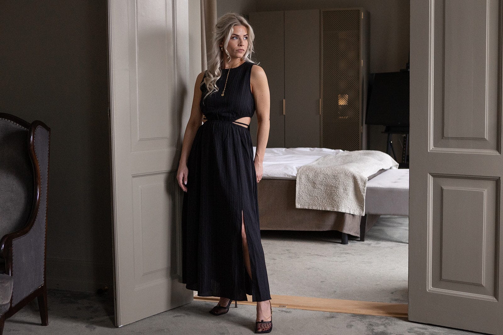 Sort kjole fra Molly & My X Melanie Due med ærmeløst design, udskæringer i taljen og slids i siden. Kjolen går til anklen.