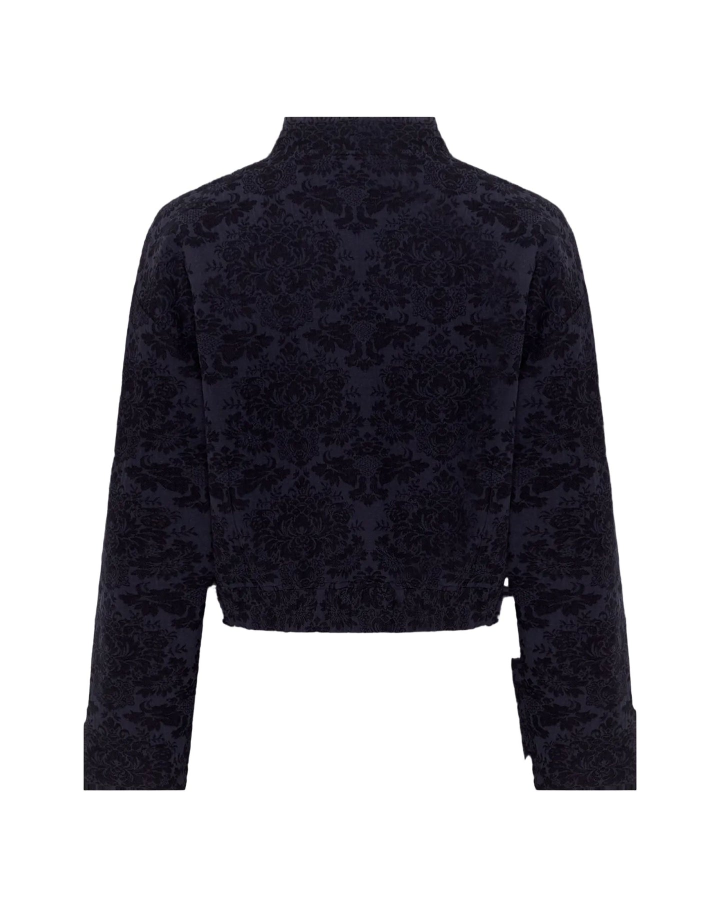 Jakke fra Moss Copenhagen i en mørkeblå nuance med et floralt mønster over hele stoffet. Jakken har lange ærmer og en stående krave.