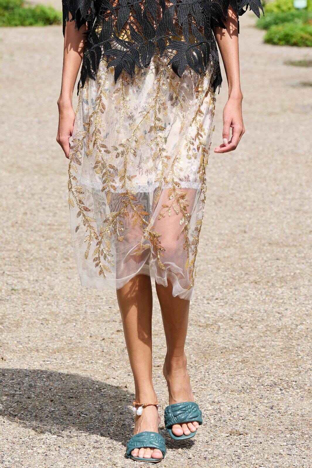 Transparent nederdel fra Munthe med guldbladbroderi. Nederdelen er lavet af let, transparent materiale med detaljeret broderi i guldnuancer med bladmotiver.