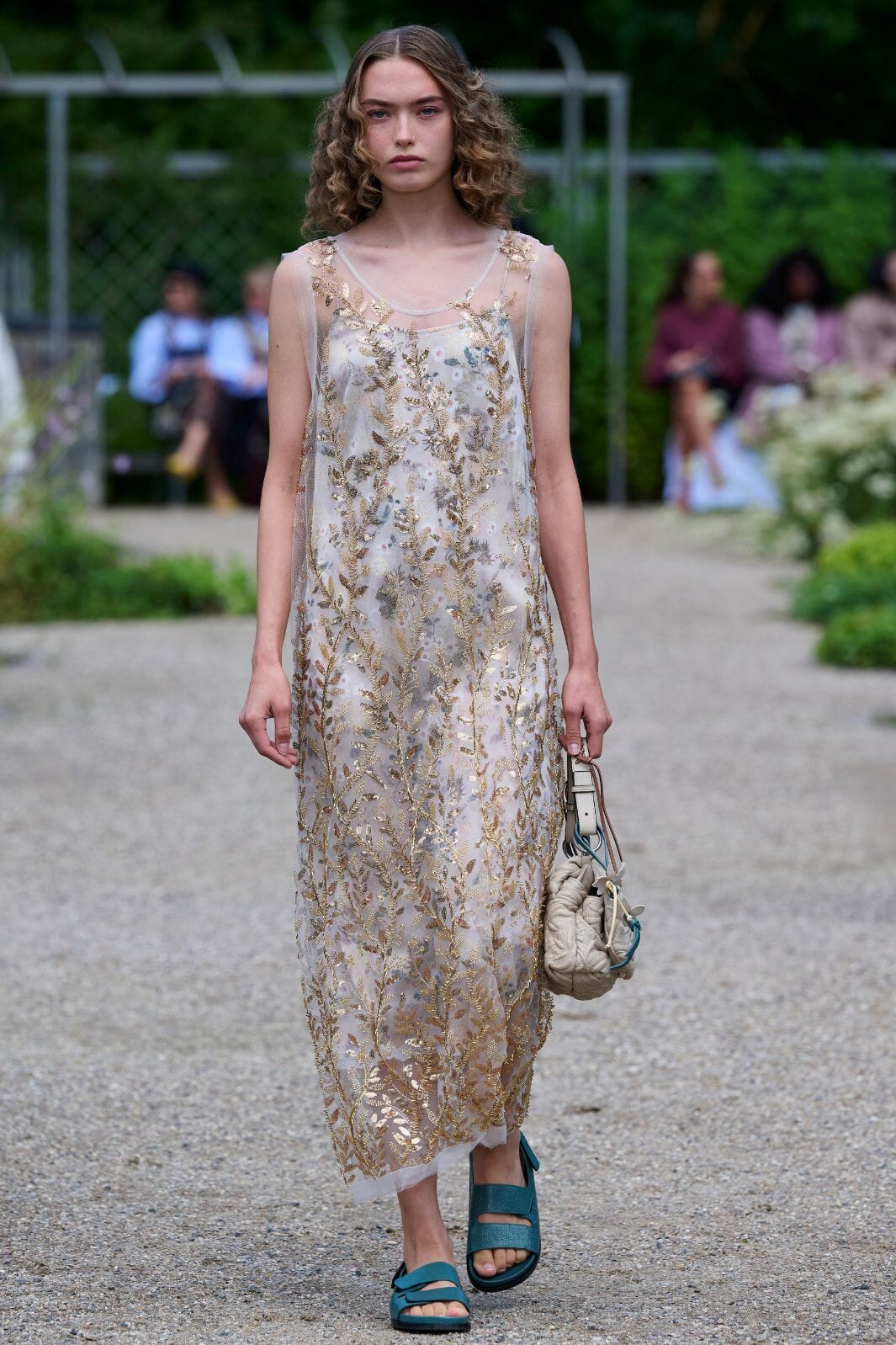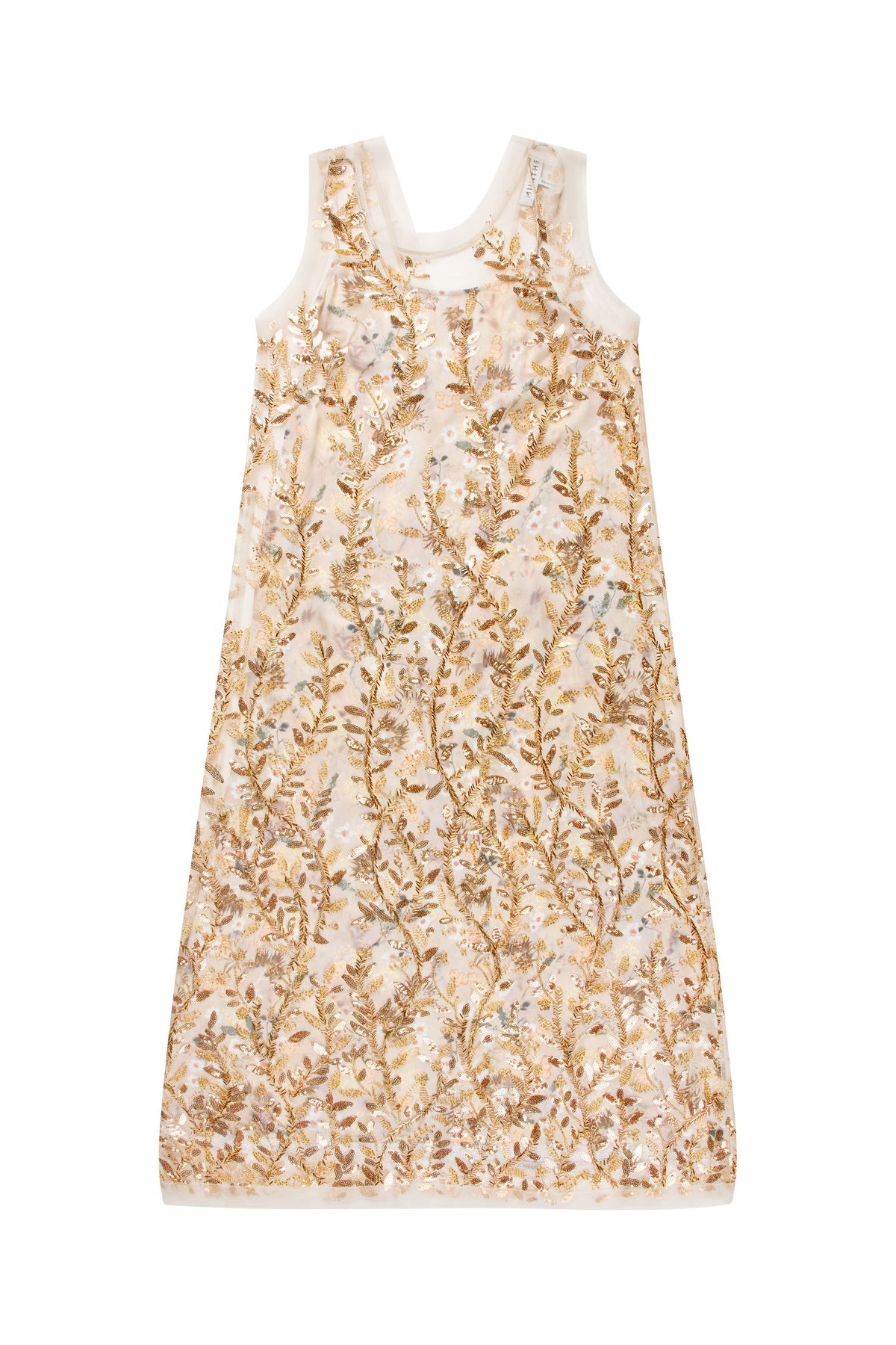 Kjole fra Munthe i guld med et blomstermønster skabt af broderi, pailletter og perledetaljer arrangeret i et bladformet mønster på semitransparent stof.