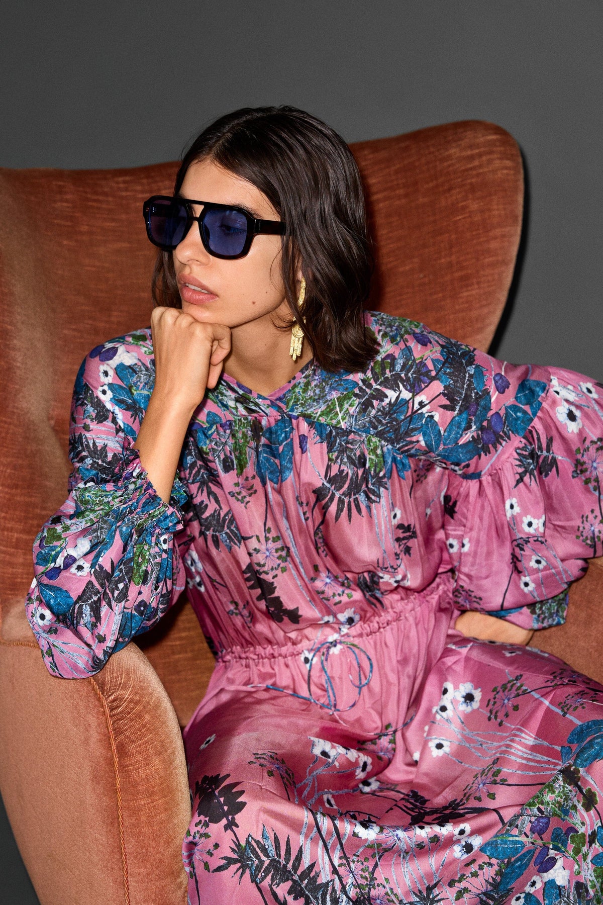 Langærmet kjole fra Munthe, lavet af en blanding af viskose og silke. Kjolen har et blomsterprint i pink og bærfarver på en løs pasform.