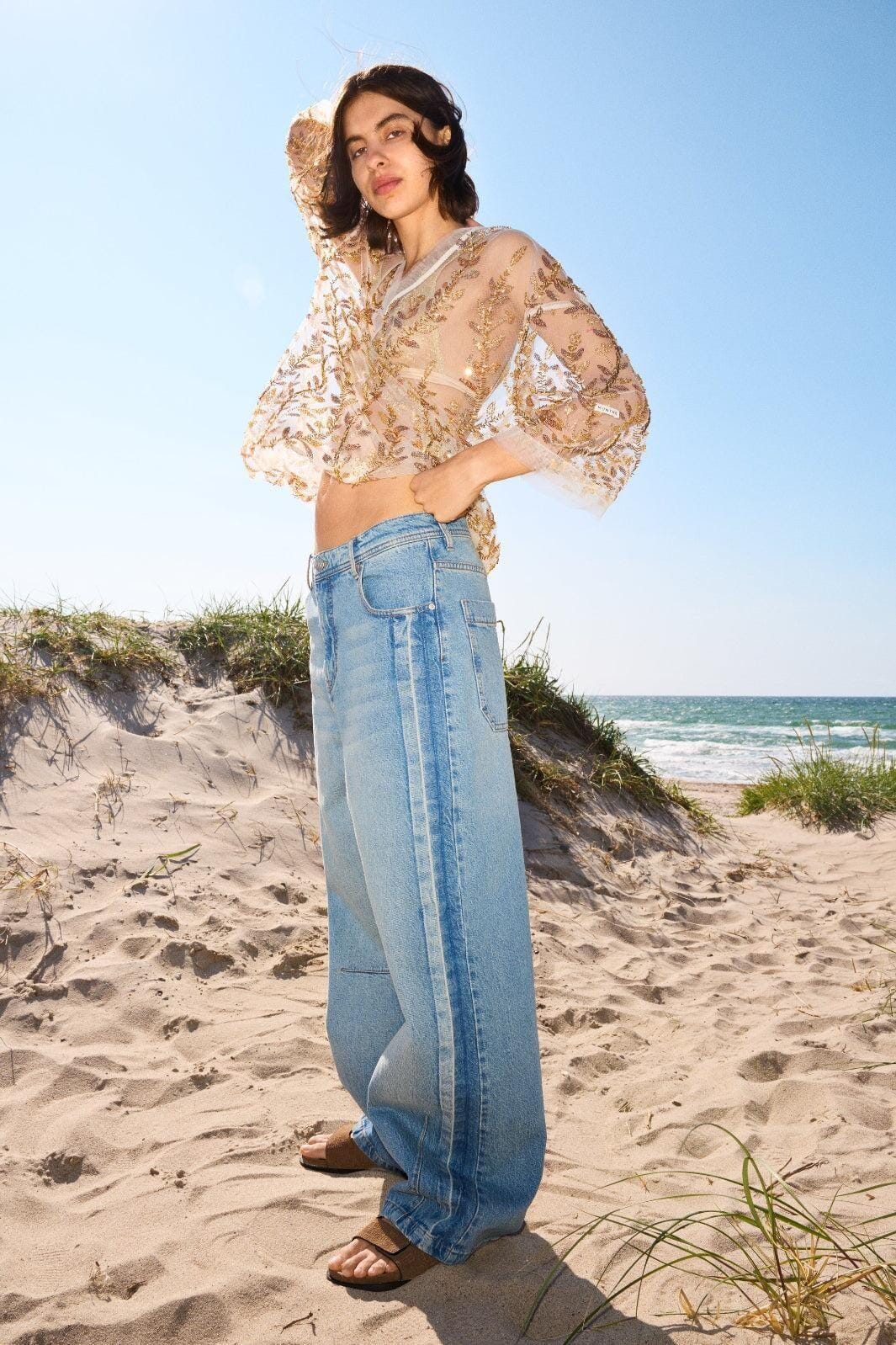 Blå jeans fra Munthe med bred, afslappet pasform. Bukserne har høj talje, gulvlang længde og stribede paneler i siderne i mørkere denim.