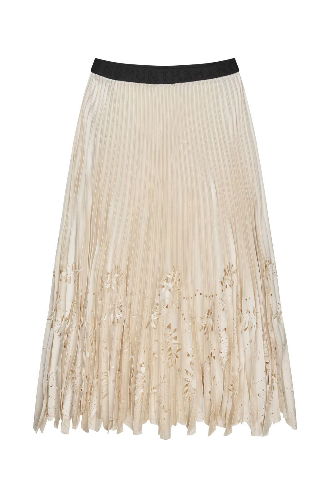 Plisseret nederdel fra Munthe i en cremelignende off-white nuance. Nederdelen er lavet af 100 % genanvendt polyester og har laserskårne blomsterudskæringer i den nederste del.
