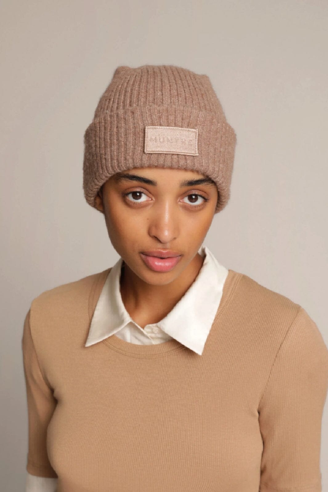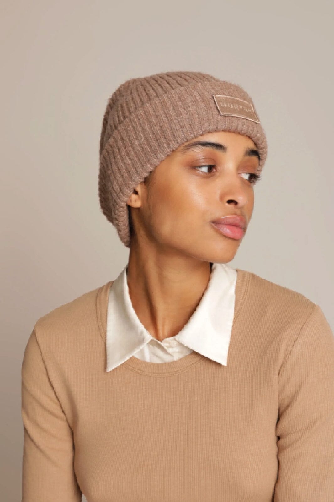 Ribstrikket hue med logo mærke foran. Fremstillet i en genanvendt polyester blanding. Fås i farven grå, beige, ice blue, charcoal eller mocca.