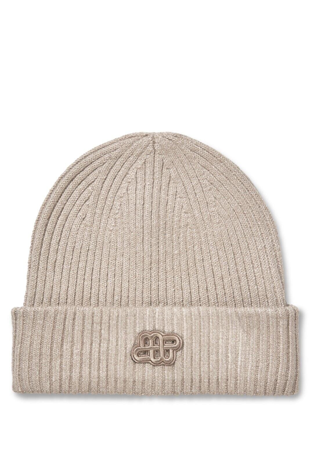 Beige hue fra Munthe med ribstrikket design. Huen har en opfoldet kant og et broderet logo på forsiden. Den er fremstillet af en blød blanding af genanvendt polyester.