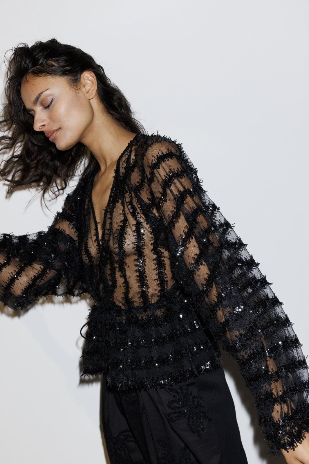 Sort gennemsigtig bluse fra Munthe med vandrette striber af pailletter. Blusen har en dyb V-udskæring og en løs pasform med lange, let puffede ærmer.
