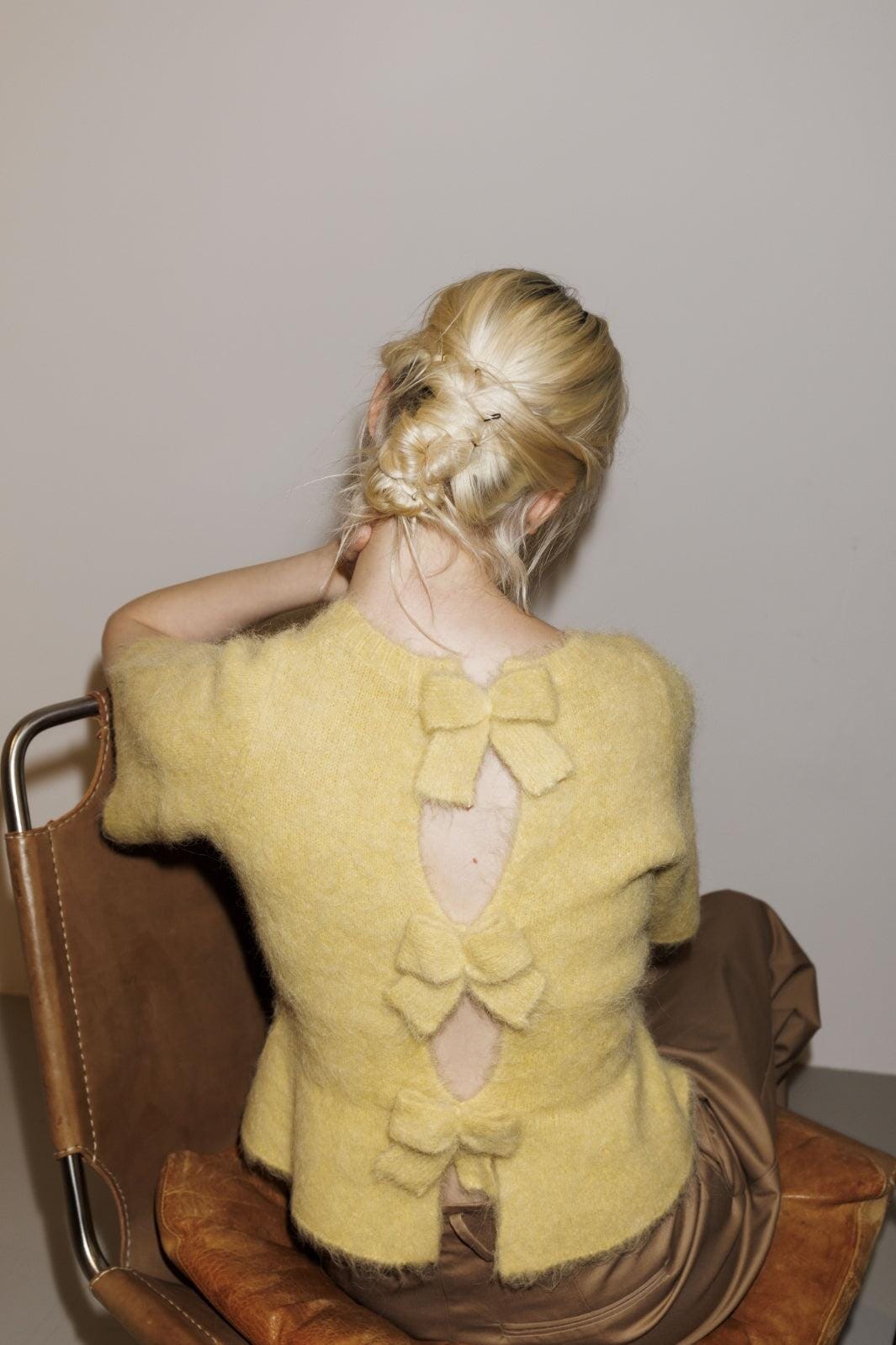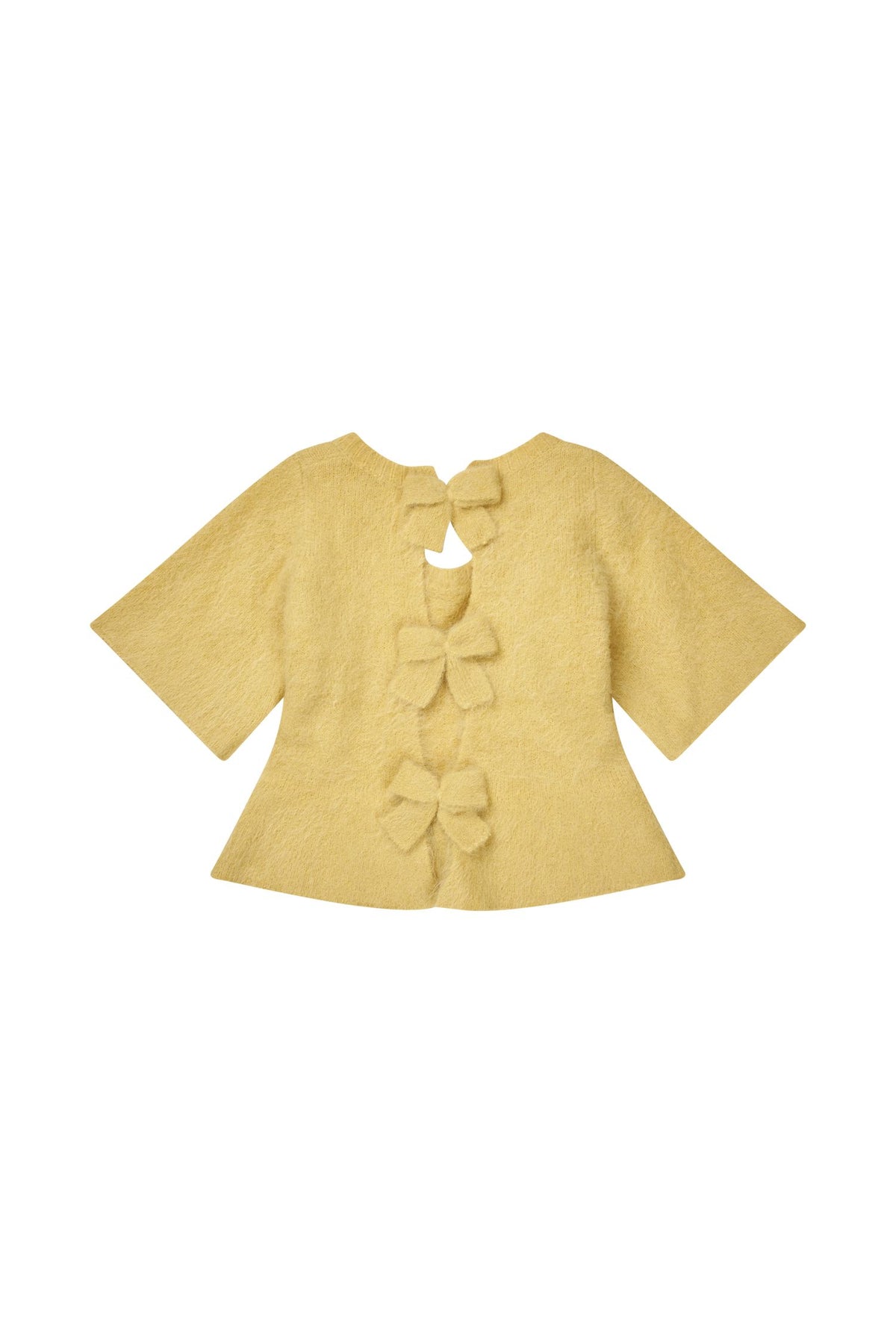 Gul strikbluse fra Munthe med kort ærme og rund hals. Strikken har en tætsiddende pasform, tre dekorative sløjfer på ryggen samt en peplum-effekt forneden.