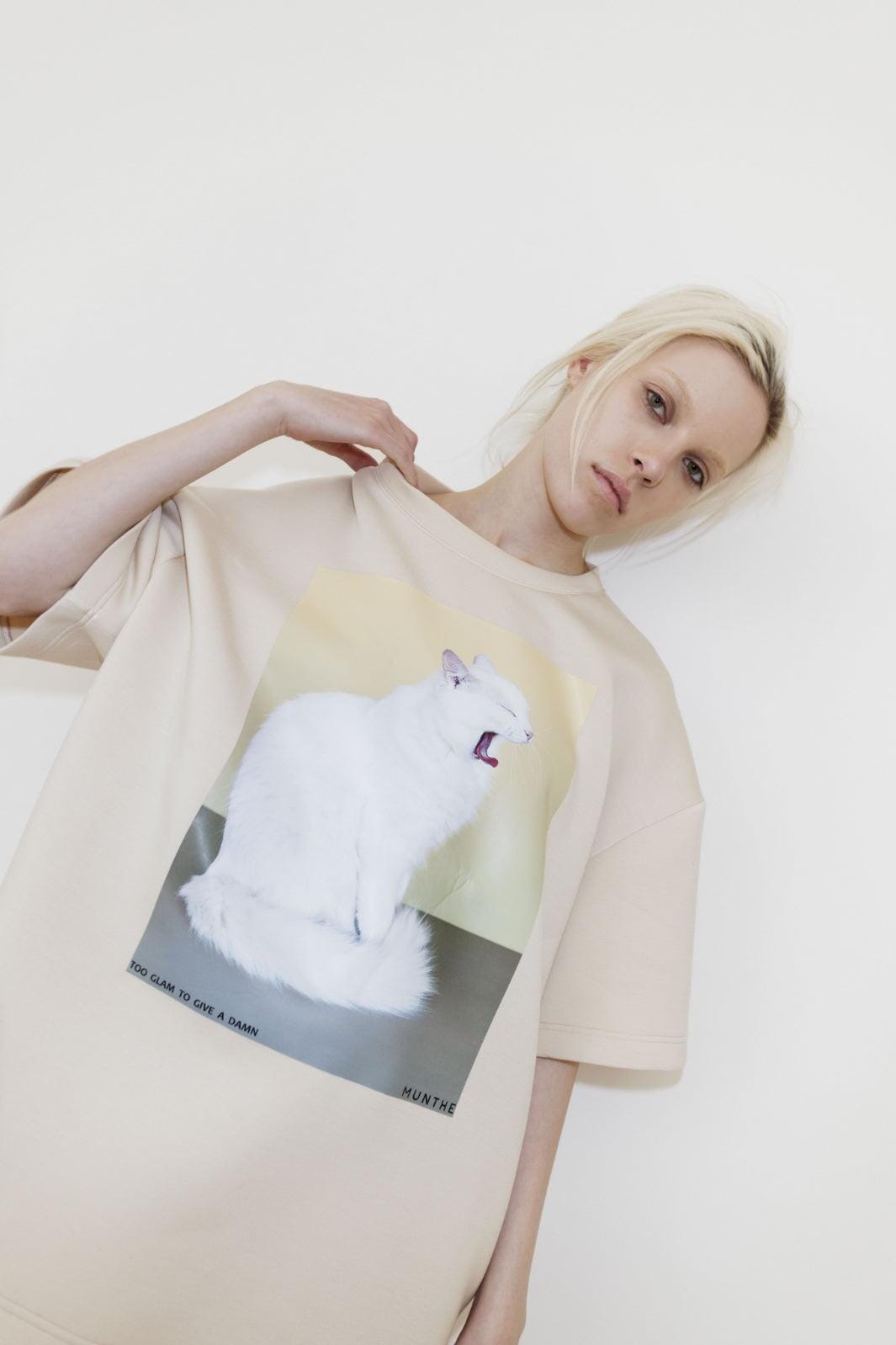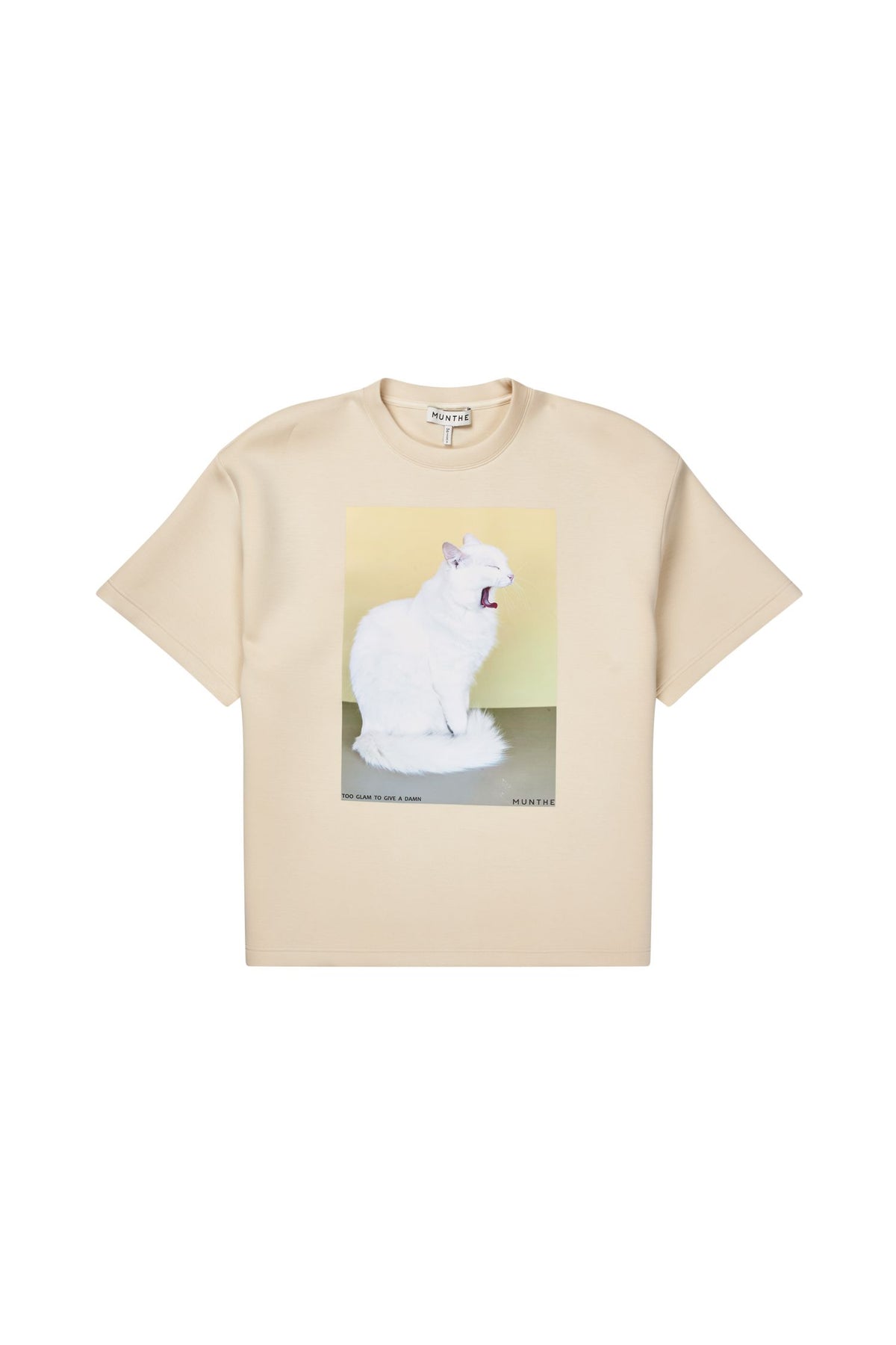 Cremefarvet t-shirt fra Munthe med stort katteprint på forsiden. T-shirten har en oversized pasform og korte ærmer med rund halsudskæring.