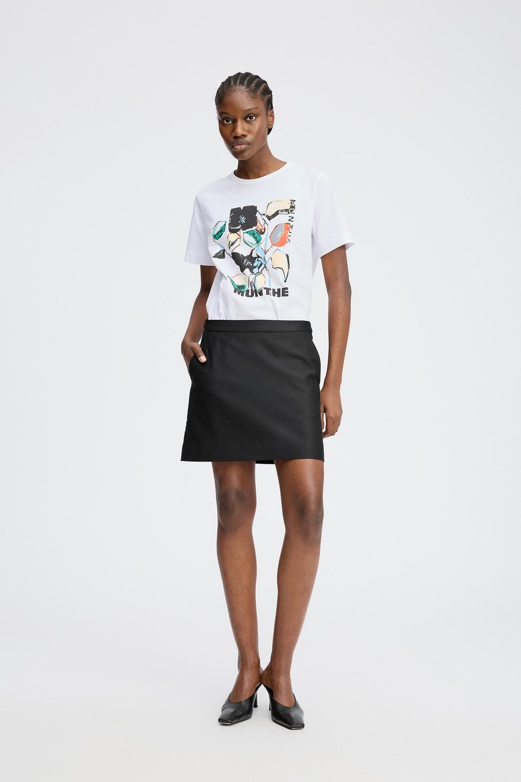 Hvid t-shirt fra Munthe med kunstnerisk print i flere farver. T-shirten har en rund halsudskæring og korte ærmer med et diskret logo på ærmet.