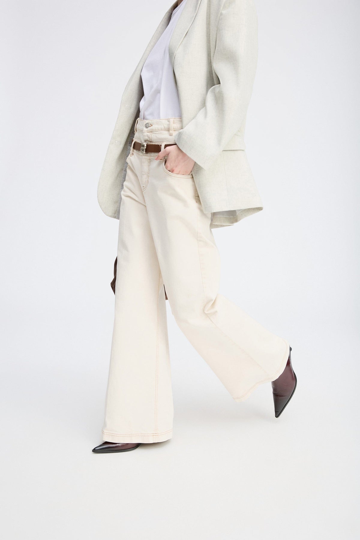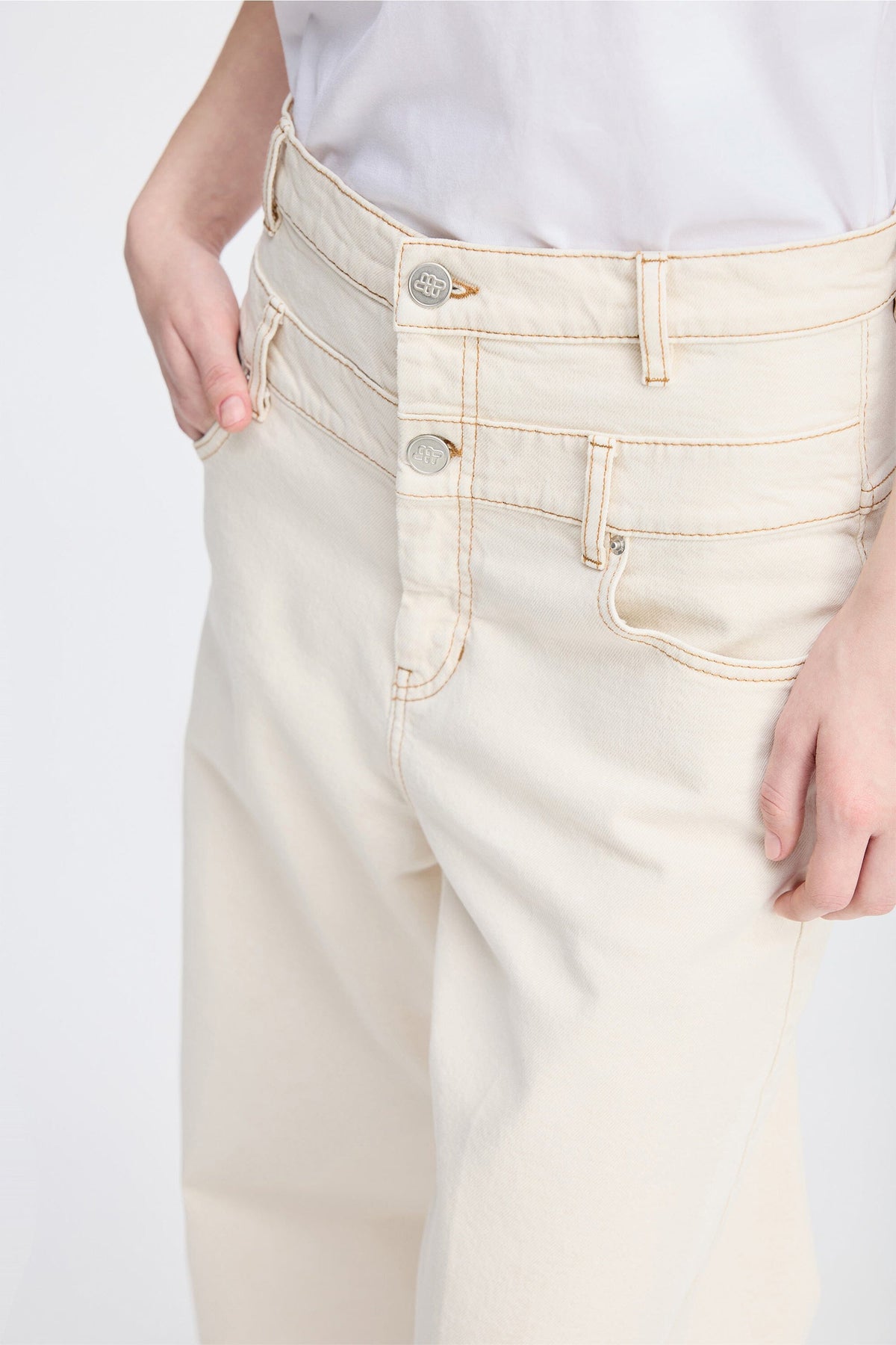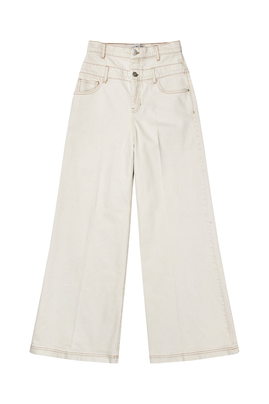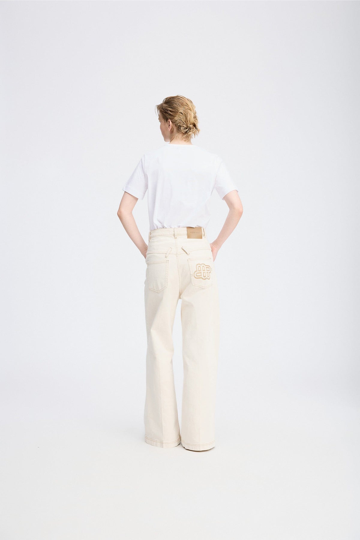 Højtaljede bukser fra Munthe i råhvid denim. Bukserne har brede ben og dobbelt knaplukning foran. Et broderet emblem pryder baglommen.