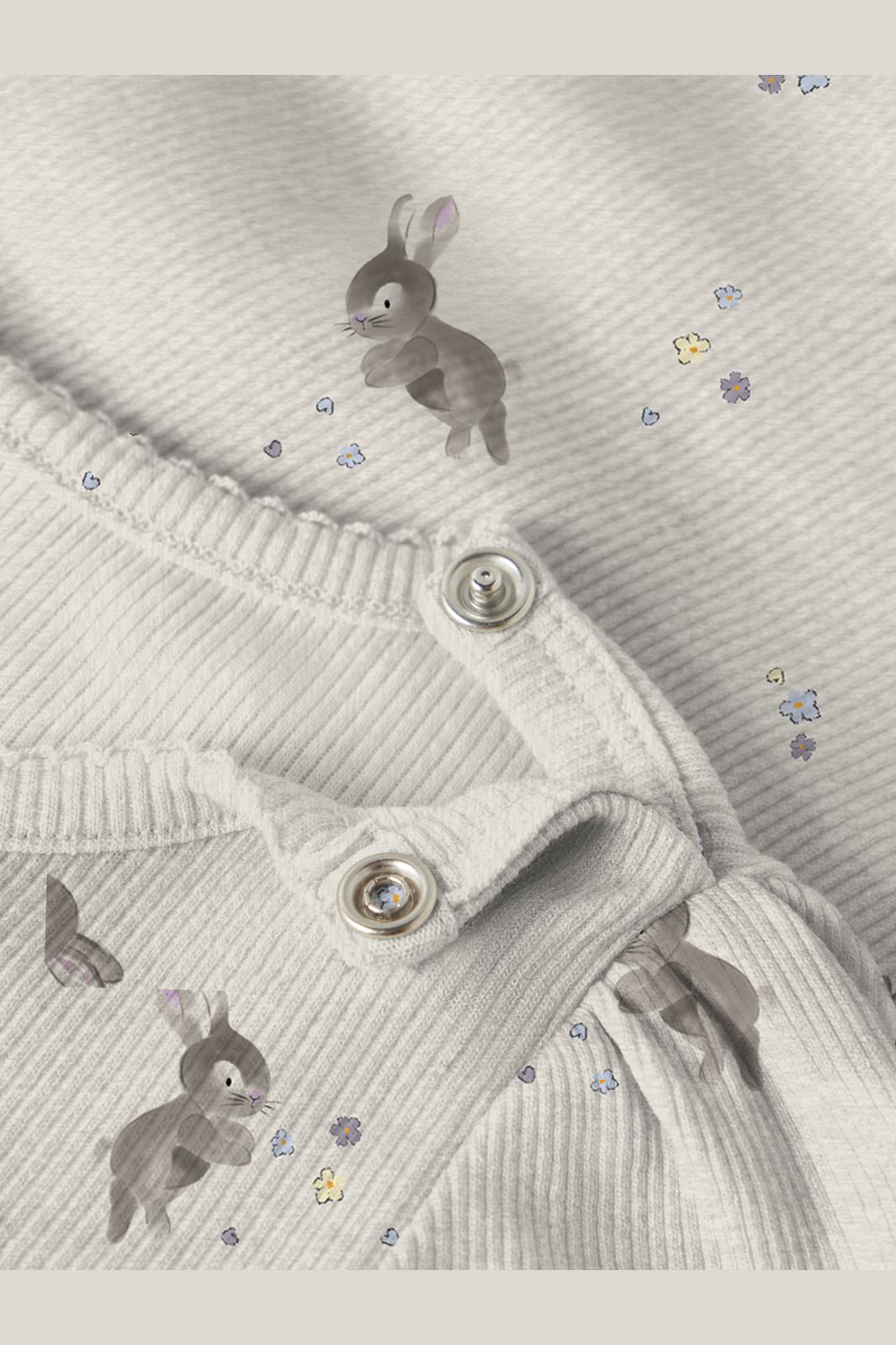 Langærmet body fra Name It med print af små kaniner og blomster på en beige meleret bund. Ribstrikket stof har en lodret, stribet struktur.