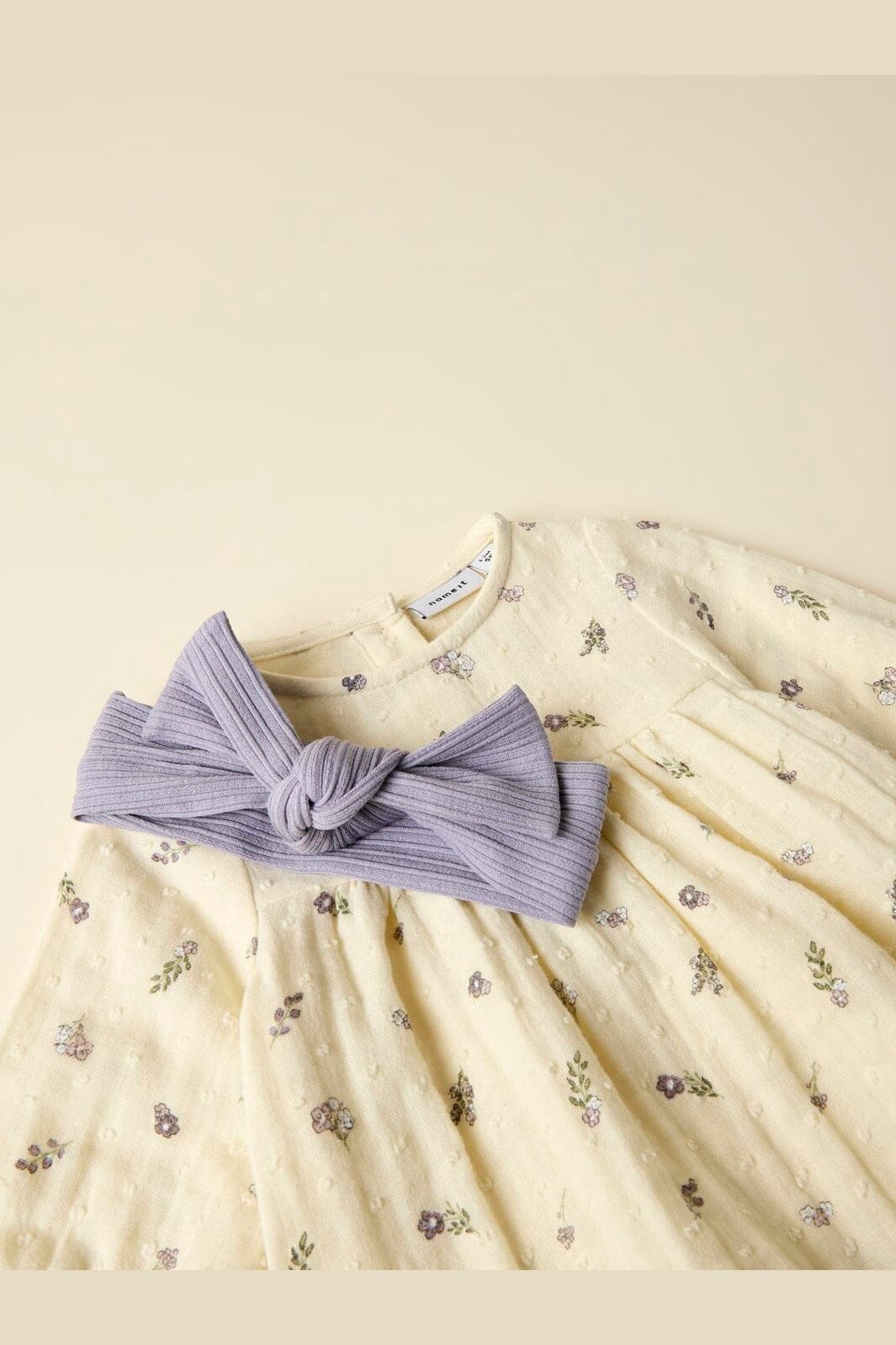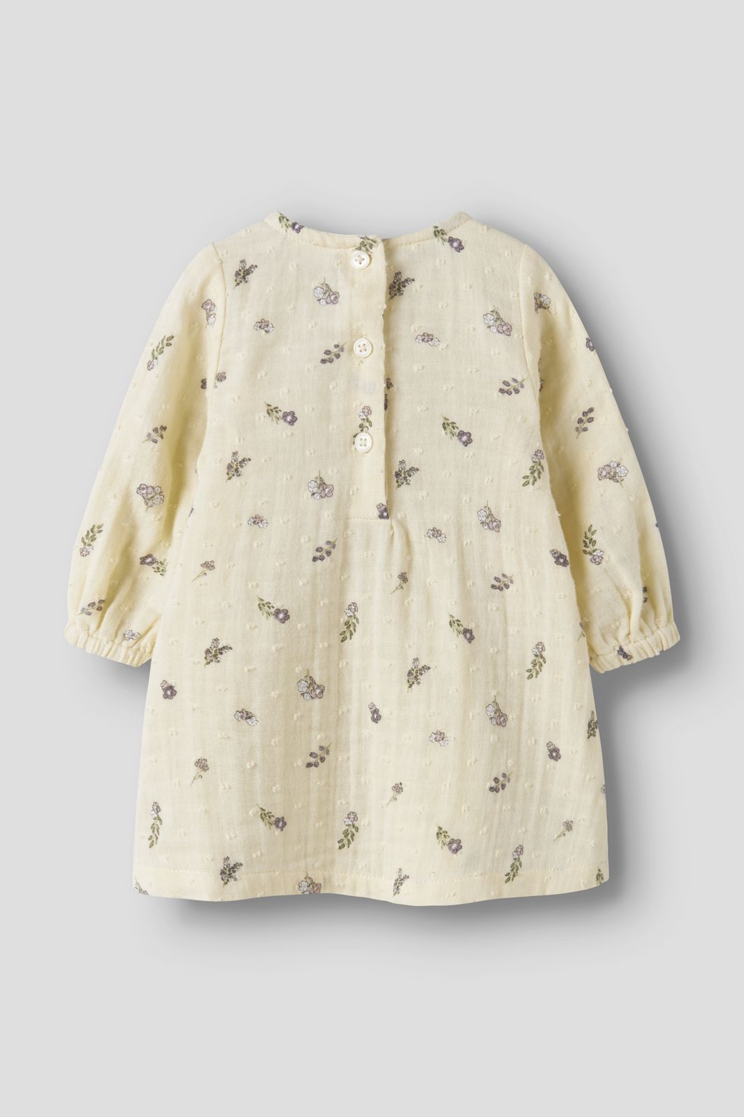 Langærmet kjole fra Name It i en lys cremefarvet nuance med småblomstret print. Kjolen er lavet af 100 % økologisk bomuld i muslin.