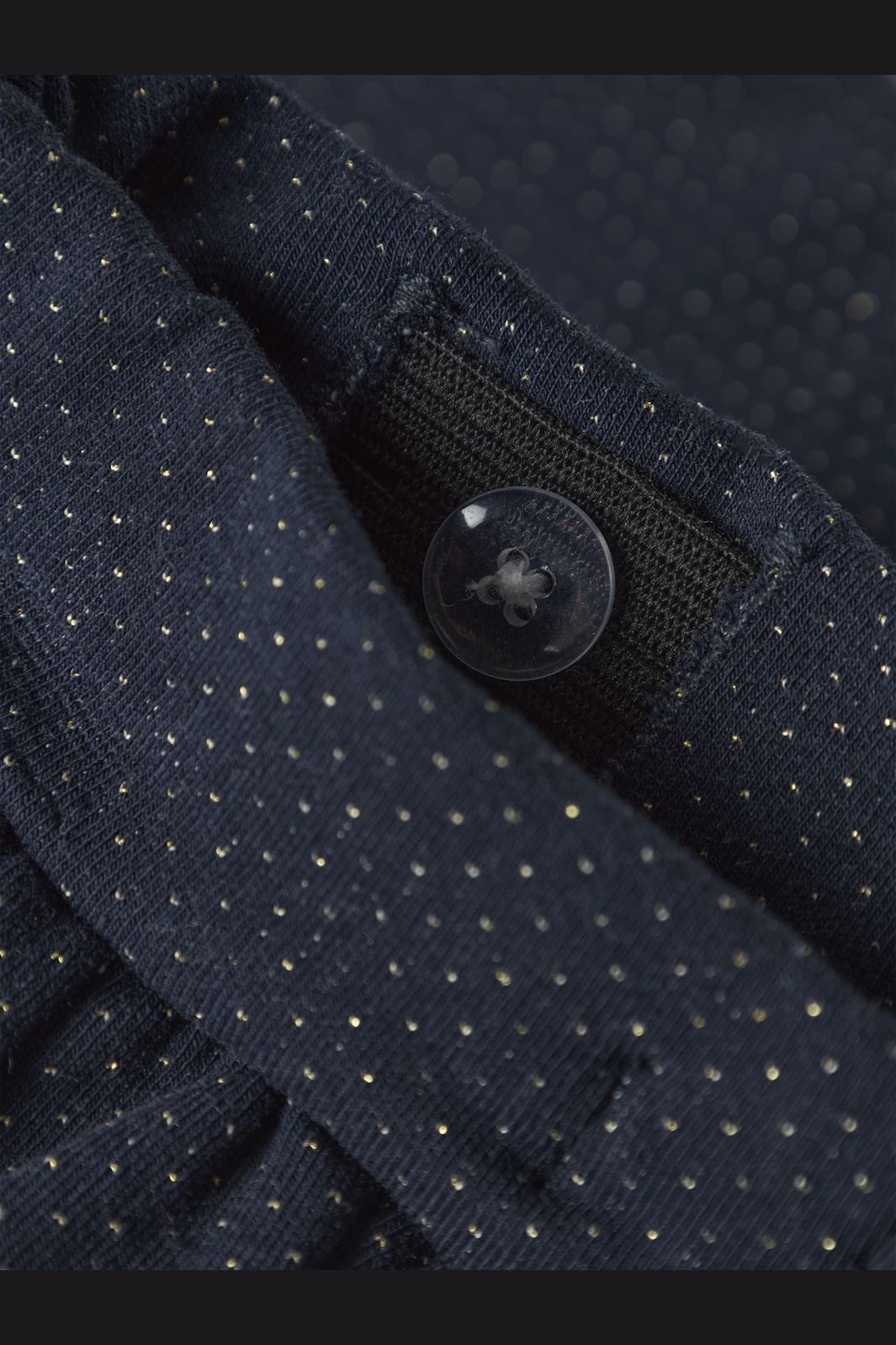 Mørkeblå sweatpants fra Name It med små prikkede mønstre over hele stoffet. Bukserne har en sløjfedetalje på linningen og elastiske manchetter ved anklerne.