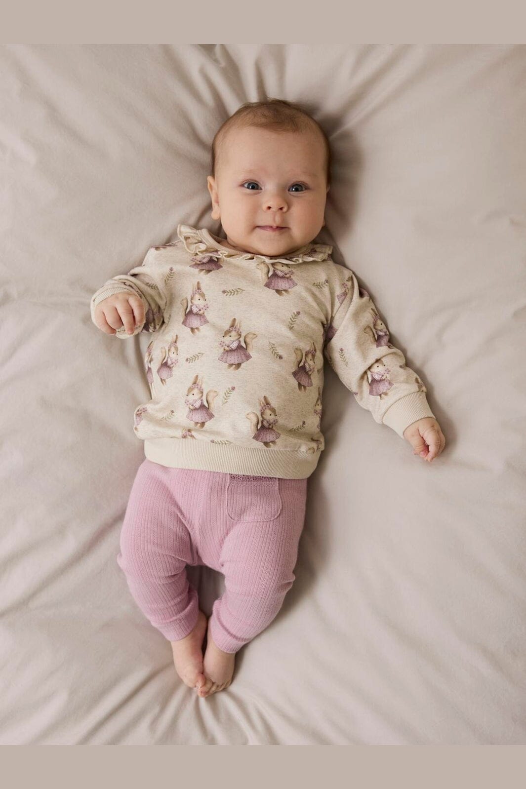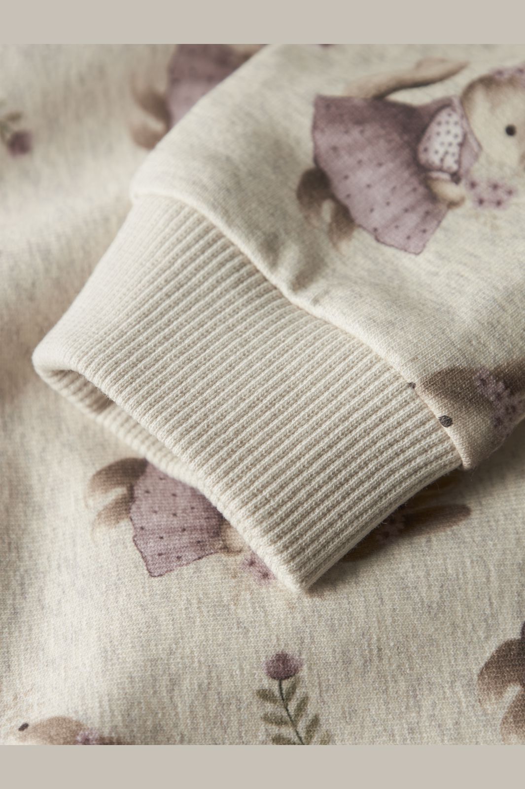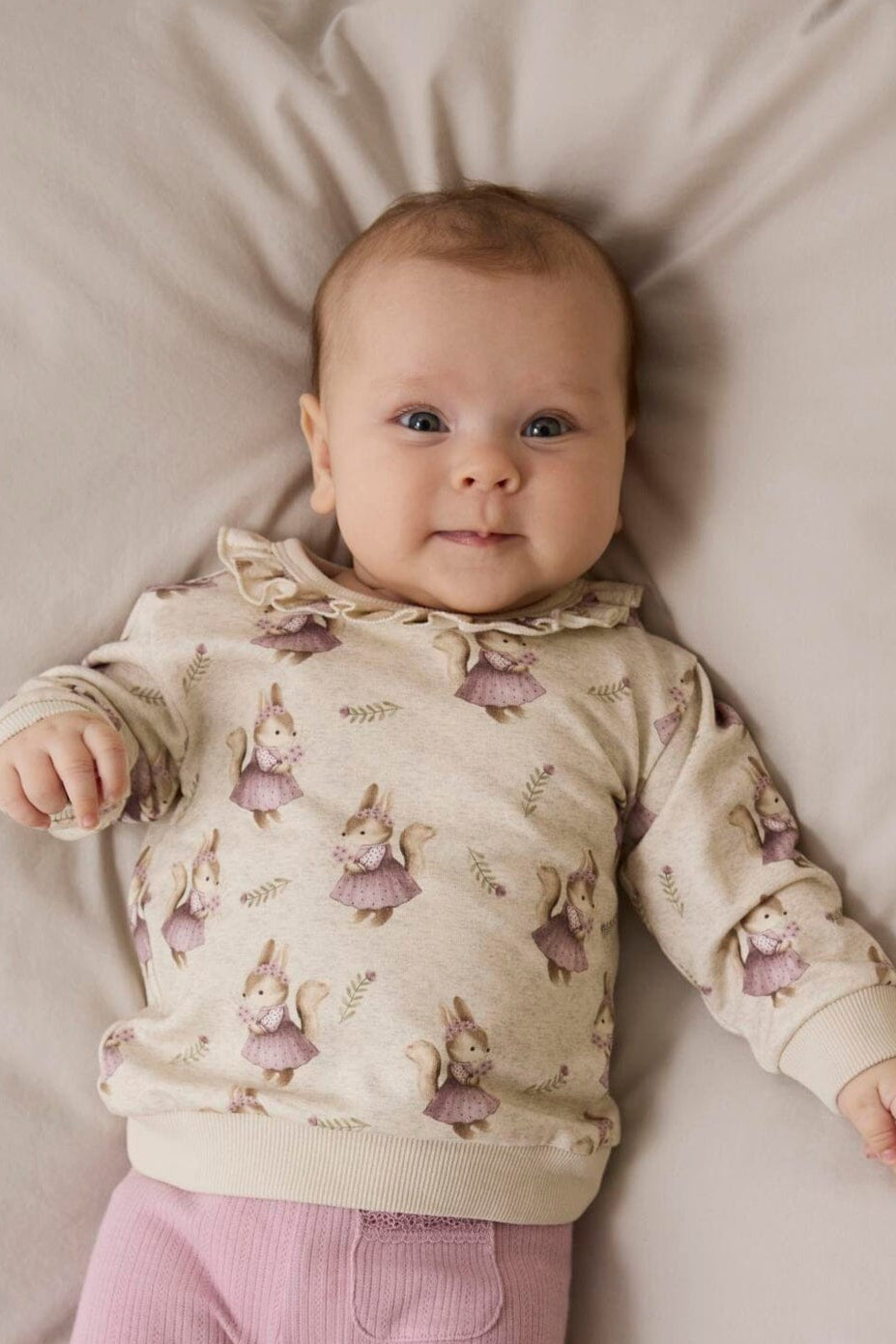 Beige sweatshirt fra Name It med et sødt dyreprint. Den har en rund halsudskæring med flæsedetalje og lange ærmer med ribkanter ved ærmerne og bunden.