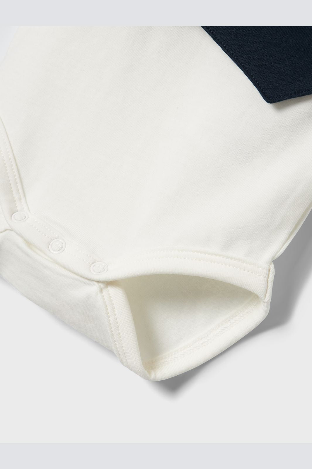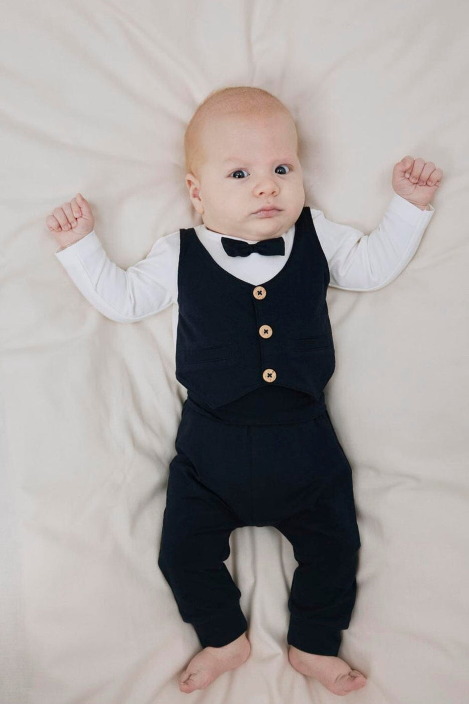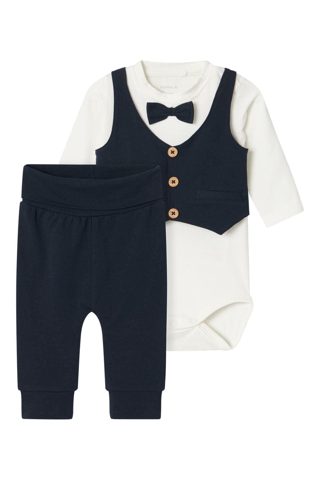 Bodysæt fra Name It med hvid body og mørkeblå vest. Sættet har lange ærmer, rund hals og en sløjfedetalje. Vesten har brune knapper, og bukserne har elastik i taljen.
