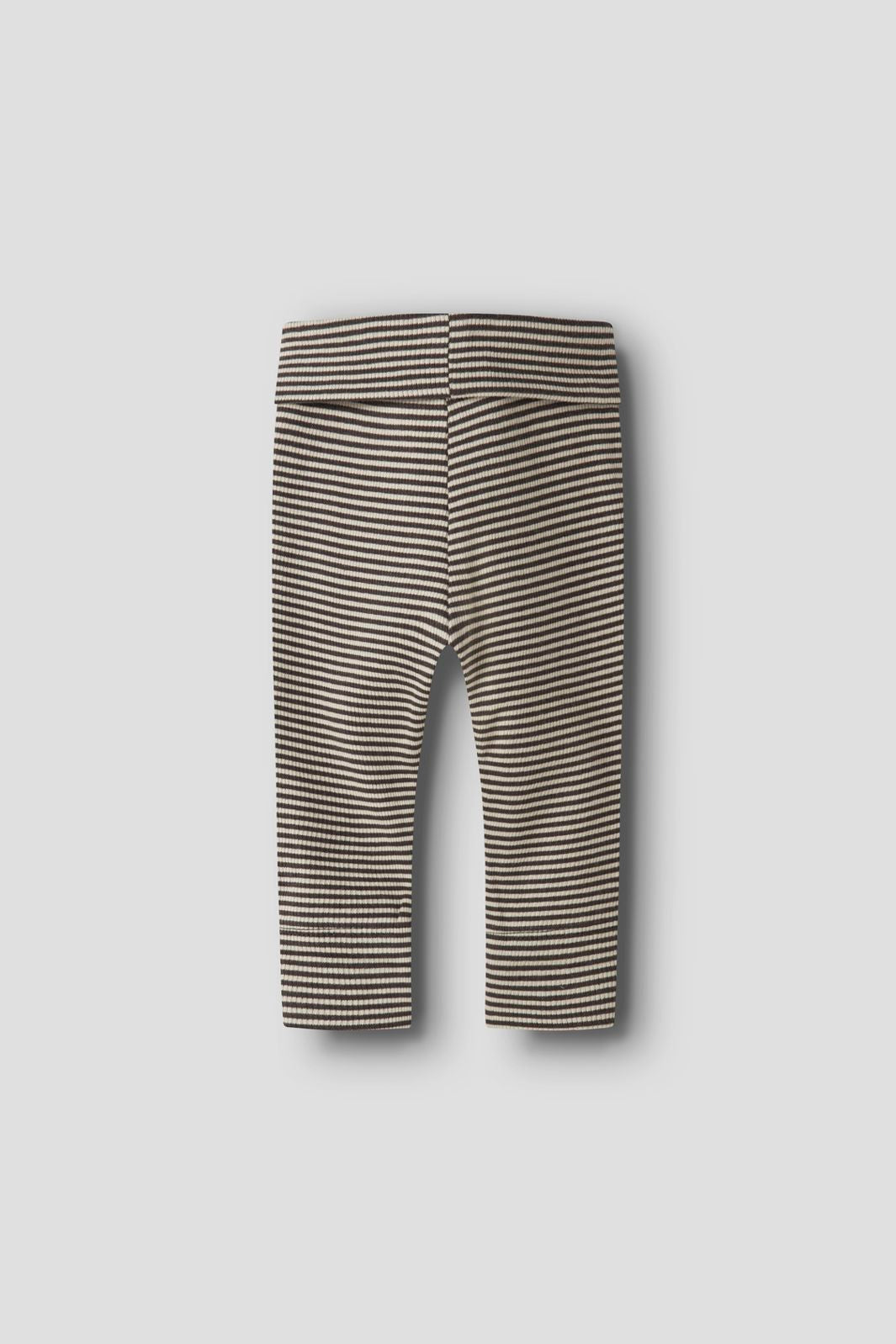 Lange underbukser fra Name It i ribstrik med striber i beige og brune nuancer. Bukserne har en elastisk talje og en regular fit-pasform med et lille brunt mærkat ved benet.