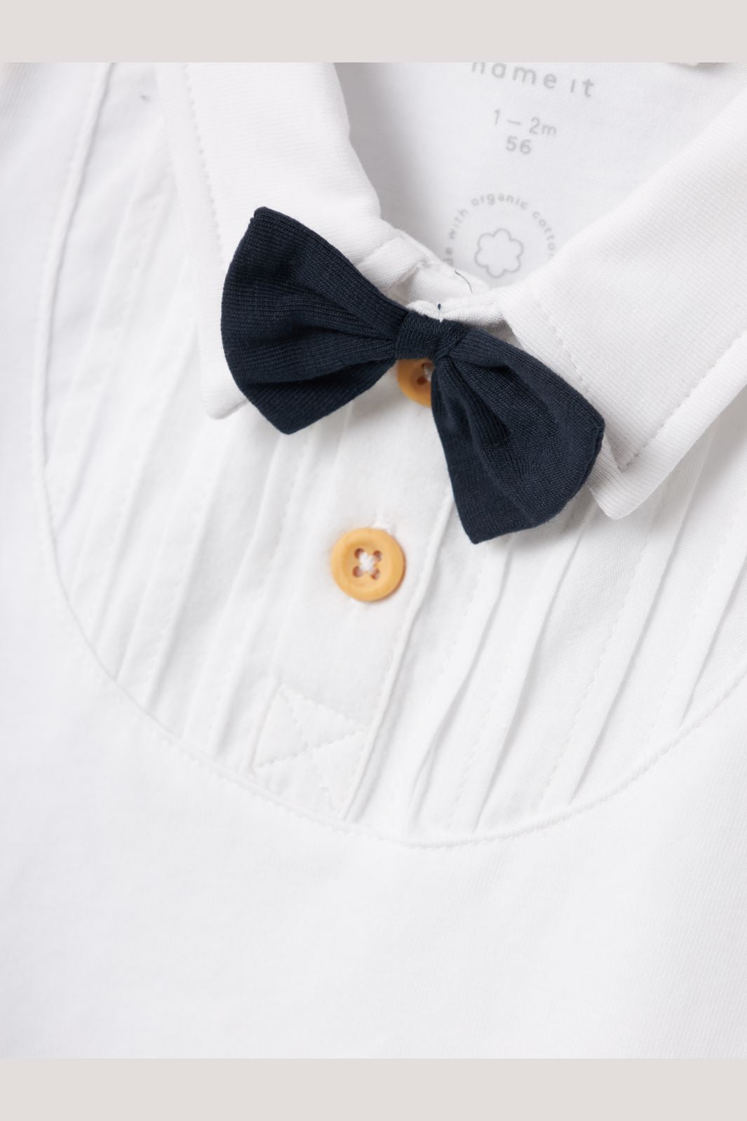 Hvid polobody fra Name It med skjortekrave og sort butterfly. Bodyen har lange ærmer og er fremstillet i en blød og strækbar jersey med plisseret front.