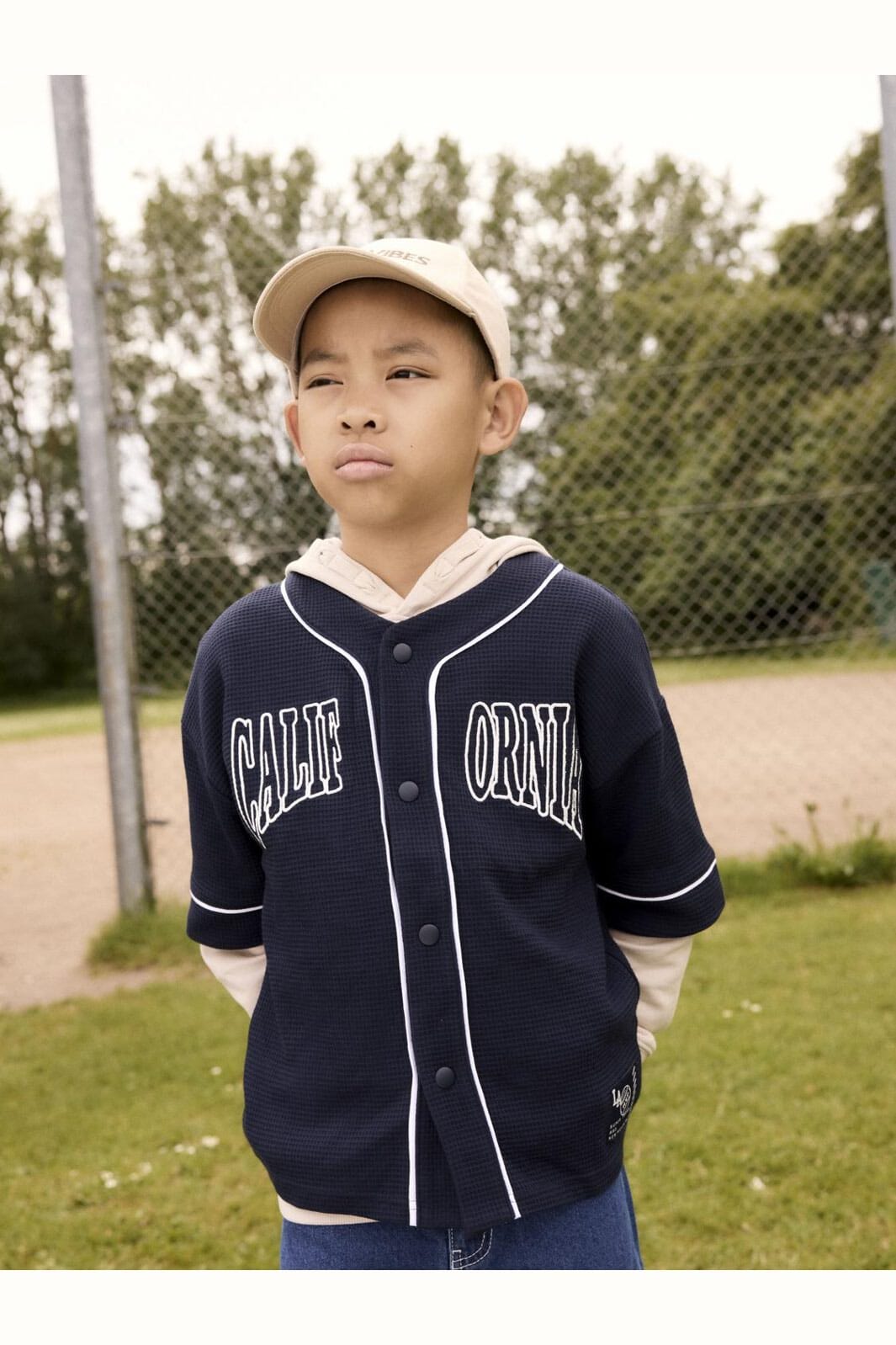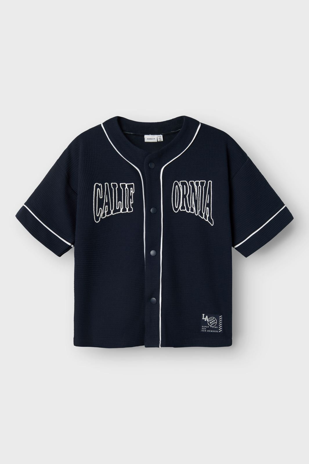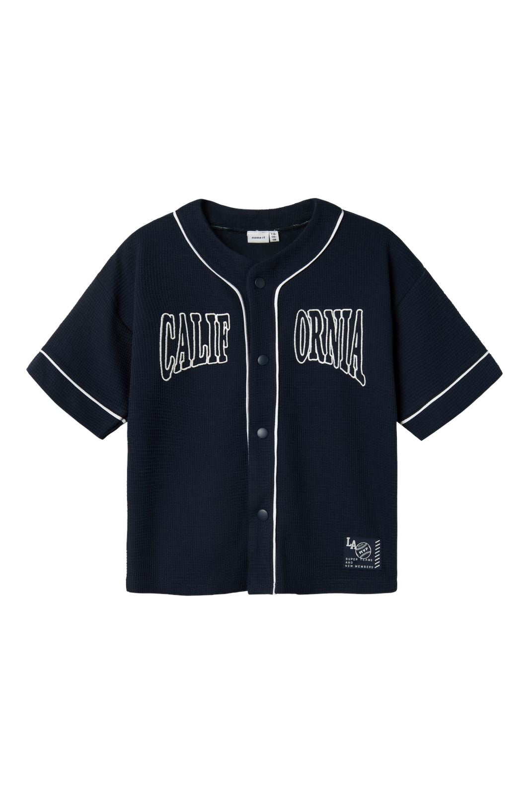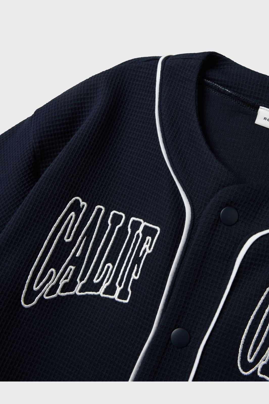 Marineblå cardigan i jacquardvævet stof med CALIFORNIA-tekst på forsiden. Den korte model har hvid piping langs kanterne og knaplukning foran.