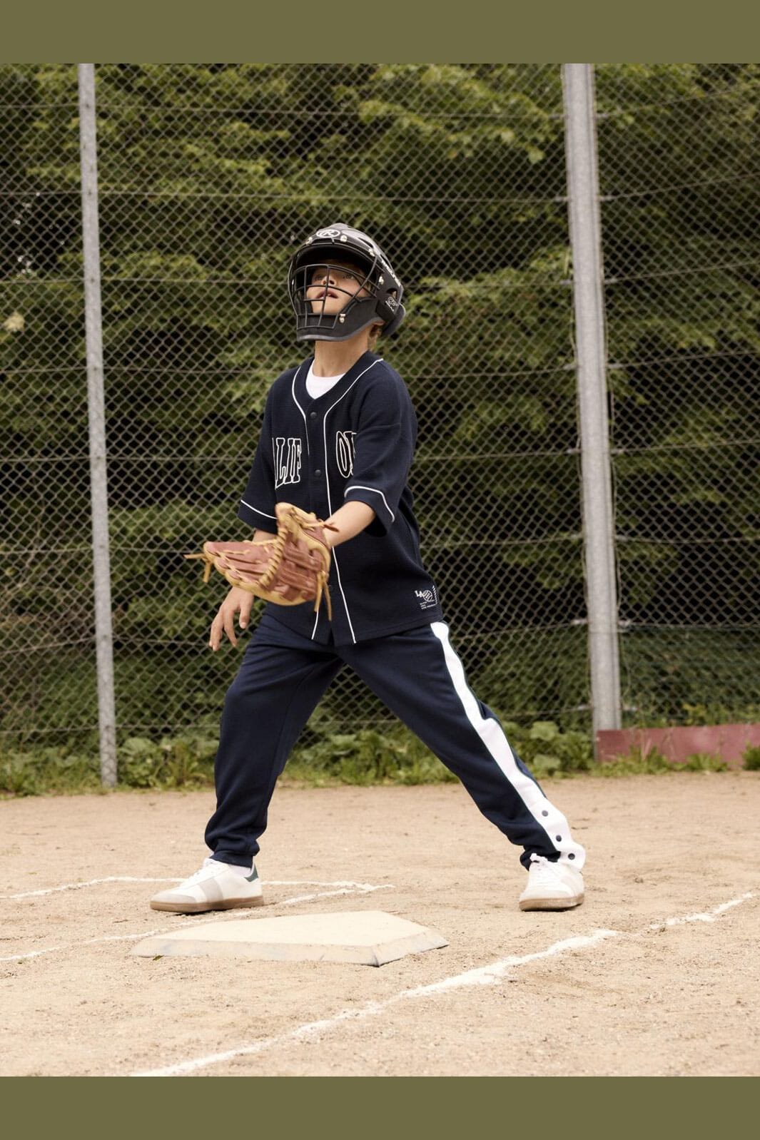 De broderede detaljer og den hvide piping langs kanterne og ærmerne skaber en sporty kontrast til det mørke stof.