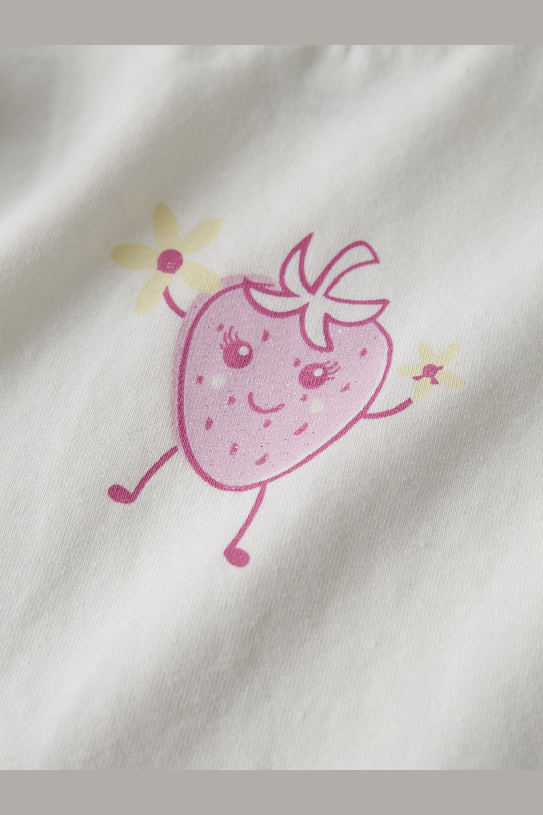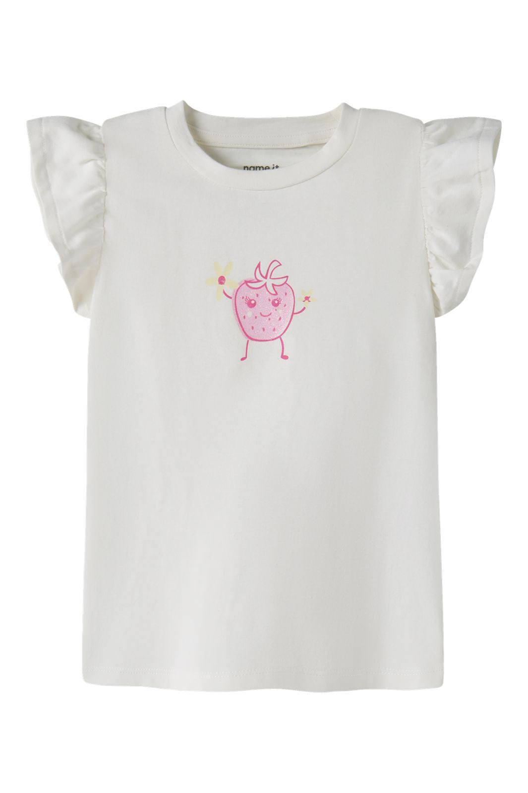Hvid t-shirt fra Name It med jordbærmotiv og glimmerprint. Lavet af jersey med en blød overflade og strækbarhed.