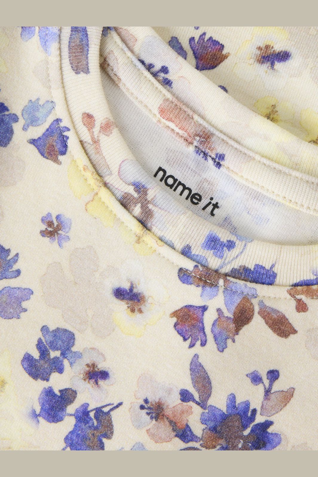 En kjole fra Name It med blomsterprint i blå, lilla og brun på en lys beige baggrund. Kjolen har korte ærmer og en samlet talje.