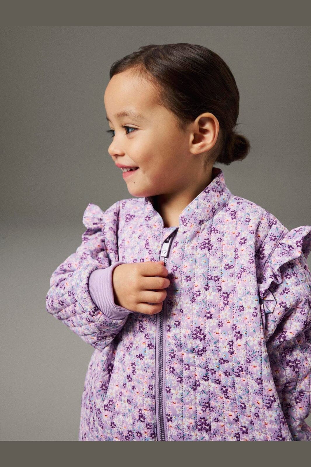 Et quiltet sæt fra Name It i lilla nuancer med et farverigt blomsterprint. Jakken har flæsedetaljer på skuldrene og lynlås, mens bukserne har elastisk talje.