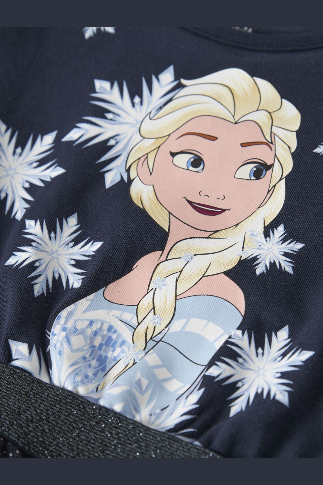Mørkeblå kjole fra Name It med tyl-nederdel. Overdelen har et snefnugprint, og nederdelen har glimtende pailletter og en elastisk talje.