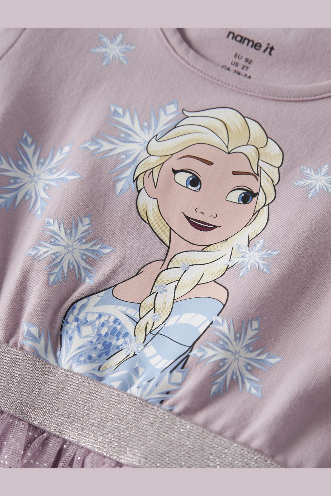Lyserød kjole fra Name It med lange ærmer. Kjolen kombinerer en blød bomulds-overdel med et glimrende tylskørt og har et karaktertryk med snefnug på fronten.