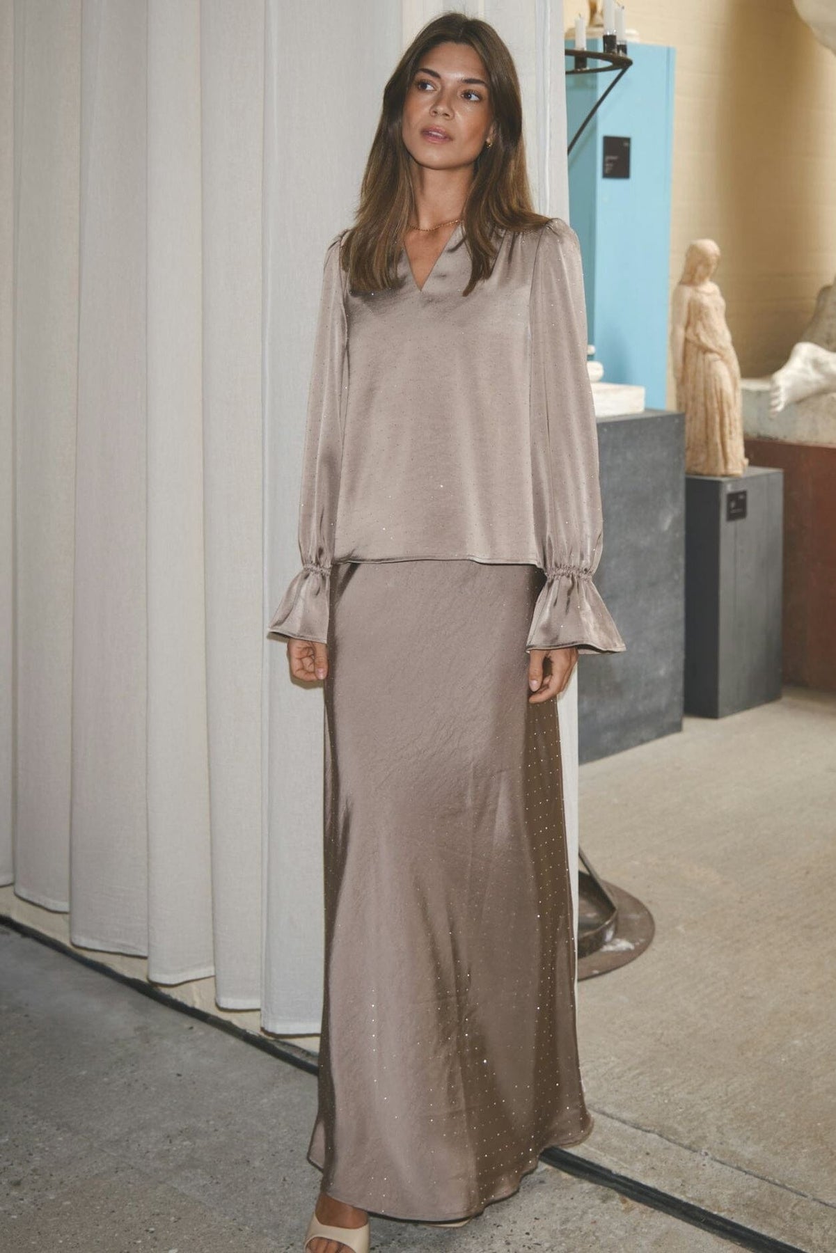 Brun satinbluse fra Neo Noir med prikket mønster og pailletter. Blusen har v-halsudskæring med rynkede detaljer og lange ærmer med flæser ved manchetterne.
