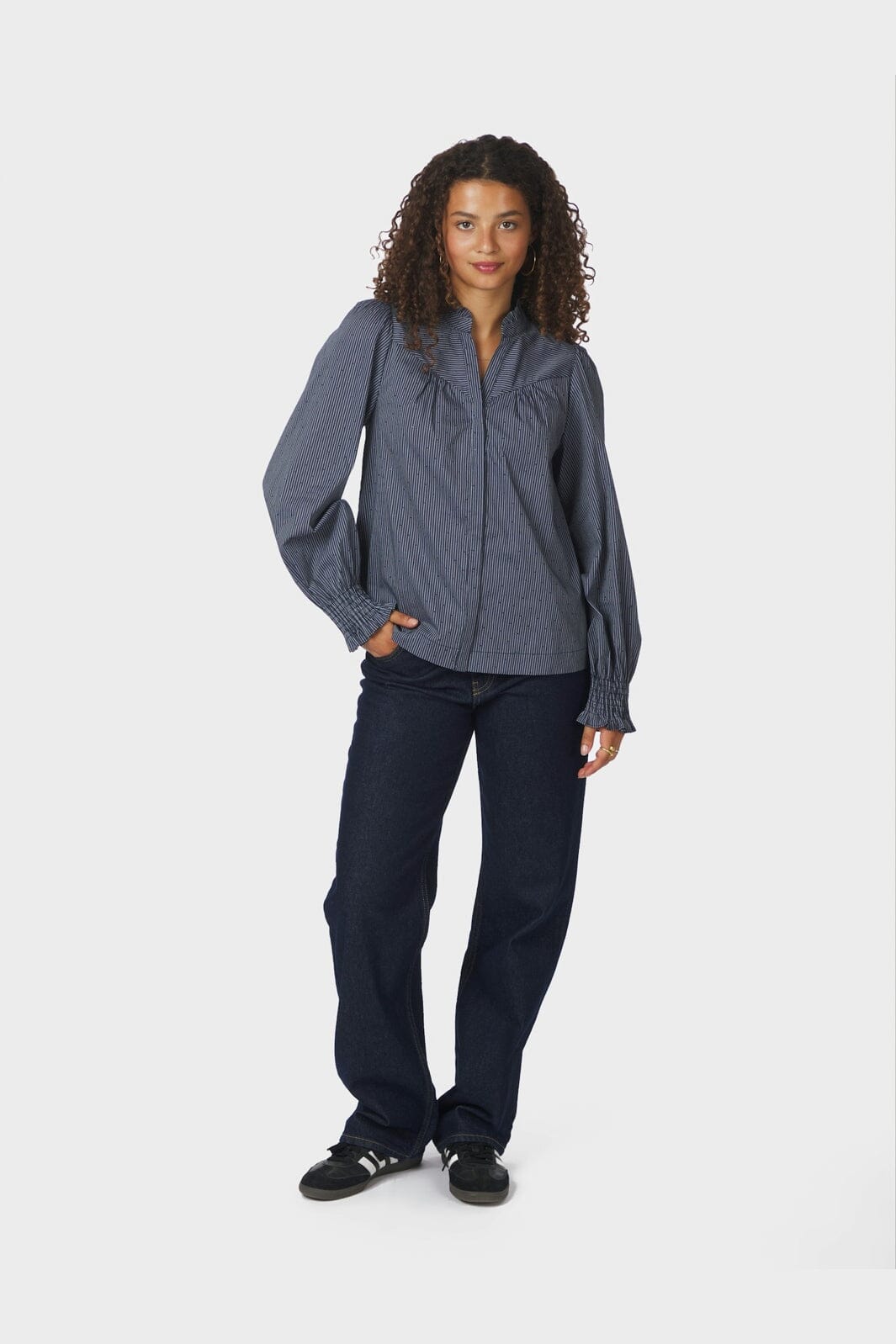 Mørkeblå stribet bluse fra Neo Noir med høj hals og lange ærmer. Blusen har smockmanchetter og en lille flæsekrave samt knapper foran til lukning.