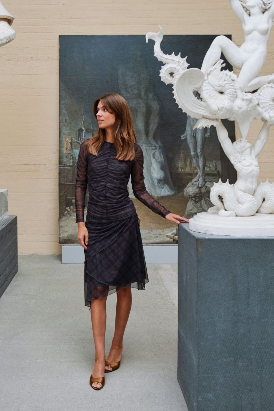 Mørkegrå meshbluse fra Neo Noir med ternet mønster. Blusen har gennemsigtige lange ærmer og rynkede detaljer på både ærmer og krop, som skaber dybde i designet.