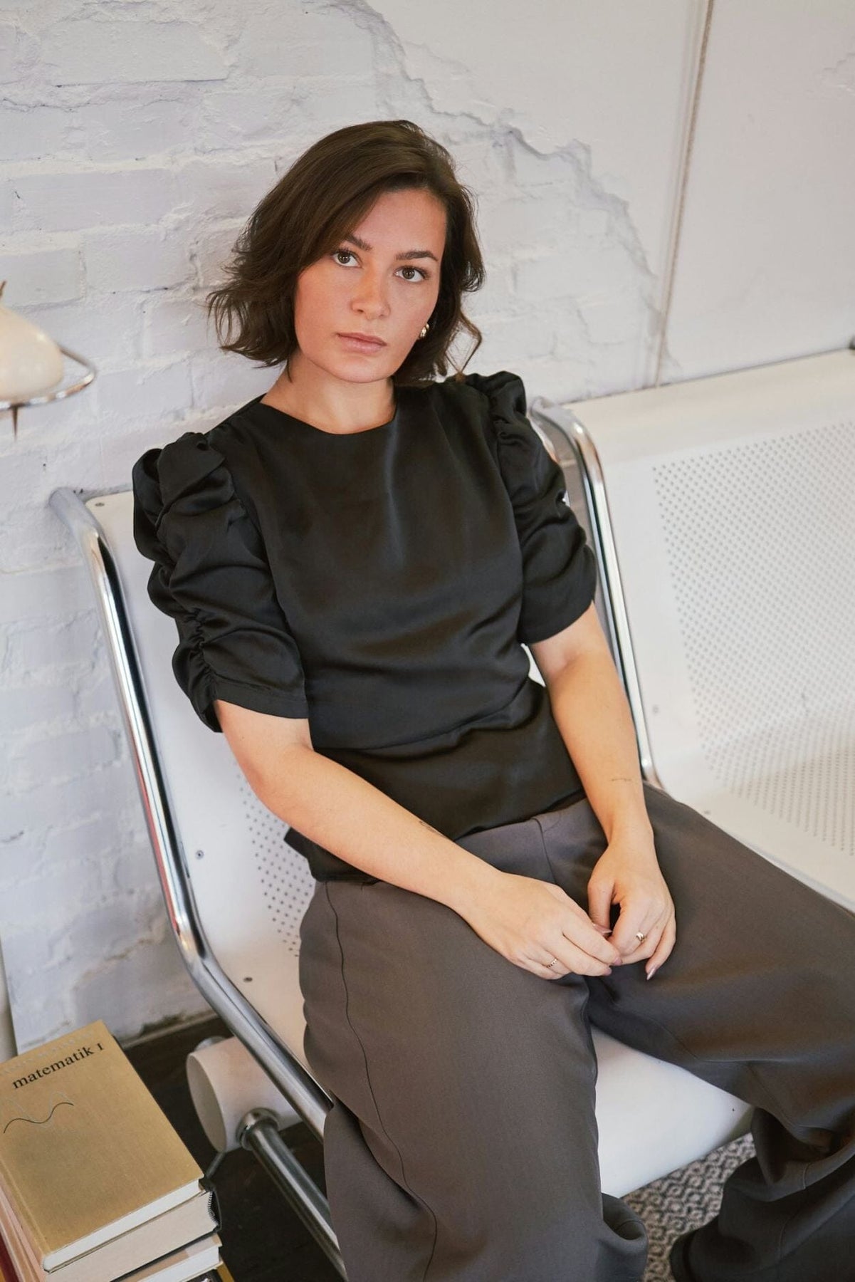 Sort satinbluse fra Neo Noir med puffede ærmer og peplumkant. Blusen har en rund hals og korte ærmer med rynkeeffekt, der giver et feminint udtryk.