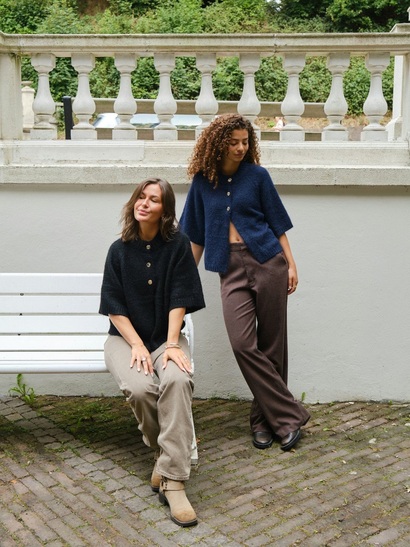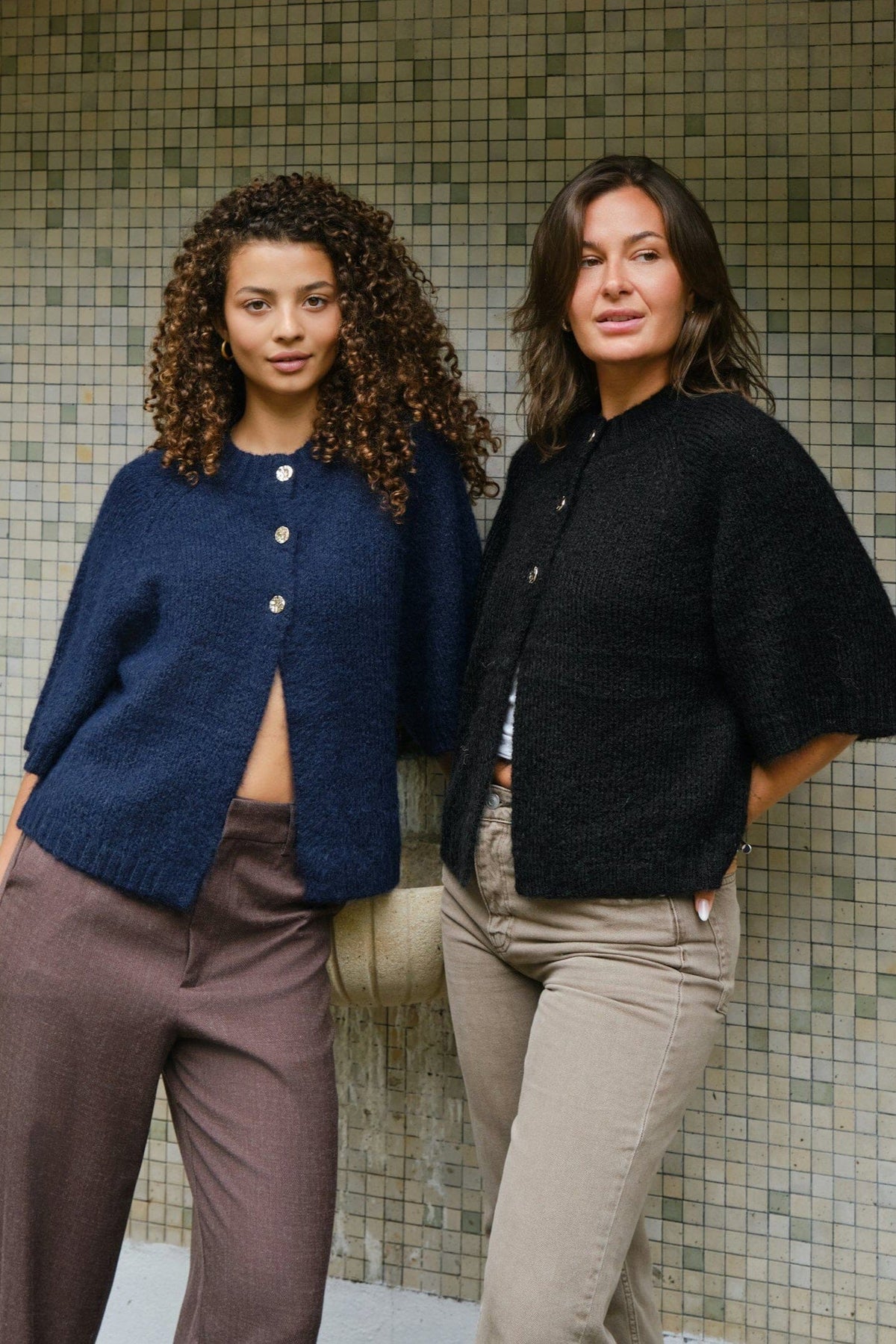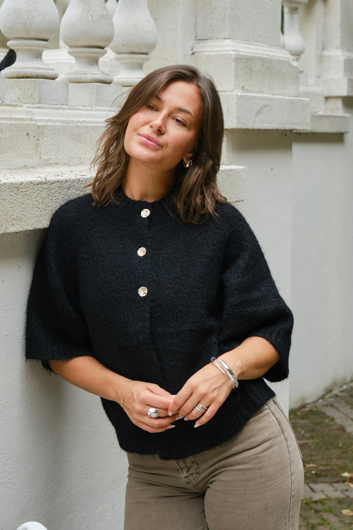 Sort cardigan fra Neo Noir i en blød, fluffy strikkvalitet. Den har en løs pasform med boxy silhuet og korte ærmer. Gyldne knapper pryder forsiden.