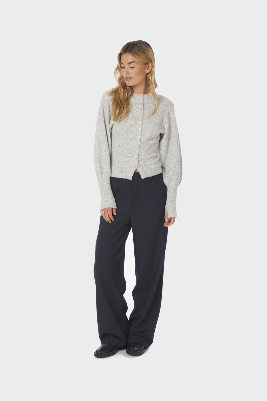 Lys grå cardigan fra Neo Noir med slim fit og rund hals. Cardiganen har brede skuldre og sidder tættere om livet og ved ærmerne. Knapperne foran gør den nem at tage af og på.