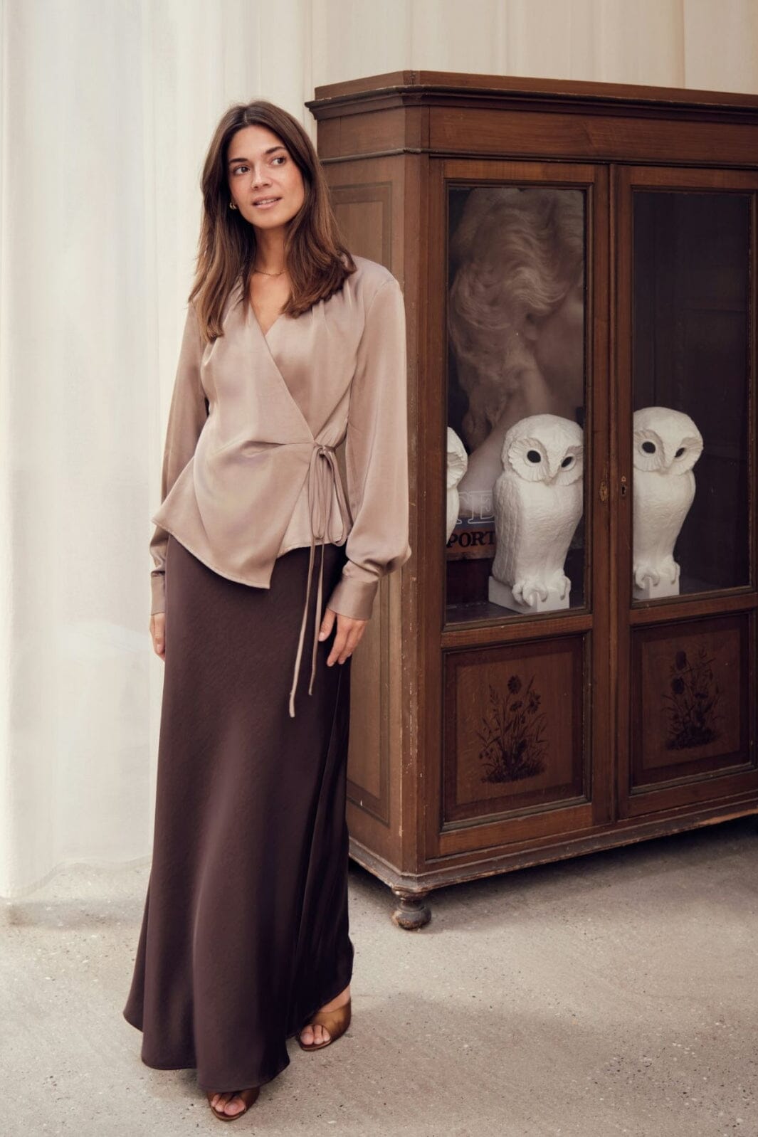 Satinbluse fra Neo Noir i mørk taupe. Blusen har en løs pasform med slå-om-design og bindebånd i siden.