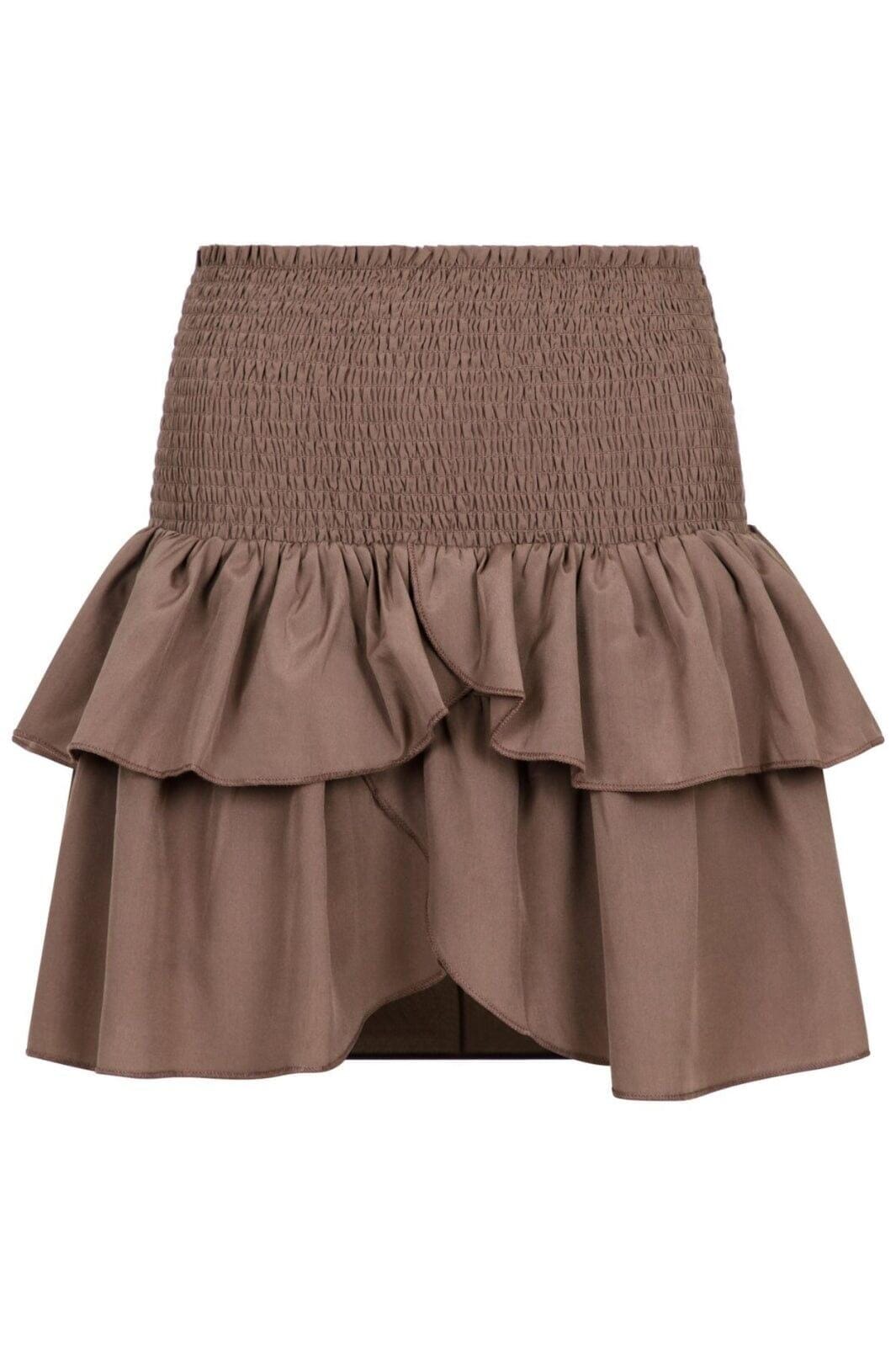 Støvet brun nederdel fra Neo Noir med to lag flæser og smock-talje. Den høje talje og lårkorte længde giver nederdelen et dynamisk udtryk.