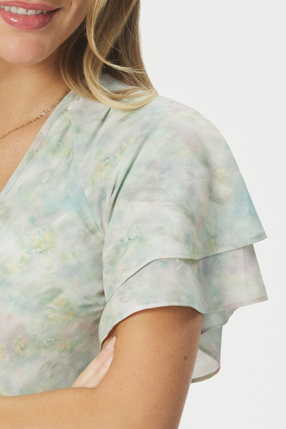 Chiffonkjole fra Neo Noir i lysegrøn med et blødt akvarelprint. Kjolen har korte, lagdelte ærmer og en V-udskæring.
