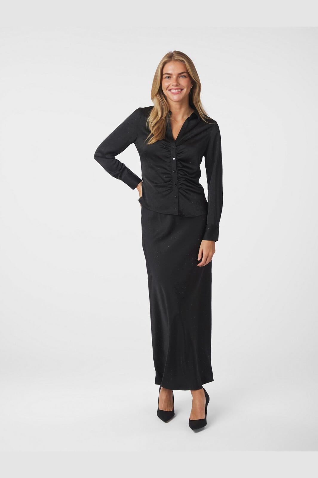 Sort skjorte fra Neo Noir i sateen med pailletter. Skjorten har en samlet front med rynker, skjortekrave og knaplukning. Den slanke pasform og det skinnende stof giver et festligt udtryk.