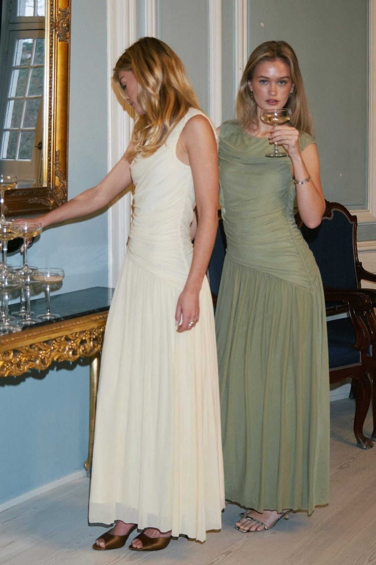 Meshkjole fra Neo Noir i en salviegrøn farve. Kjolen har rynker langs sidesømmen og en løs underdel med asymmetrisk skåret nederdel.
