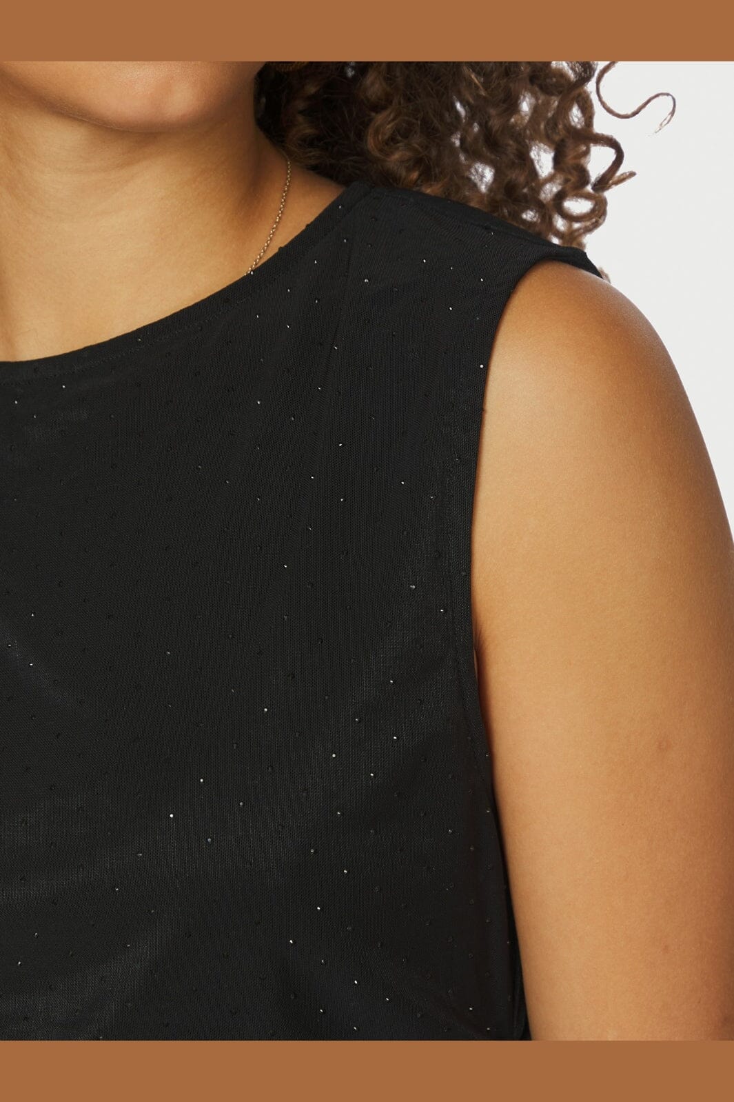 Sort meshkjole fra Neo Noir med påsyede sten og rynkeeffekter. Kjolen har en lang, kropsnær pasform med rund halsudskæring og er ærmeløs.