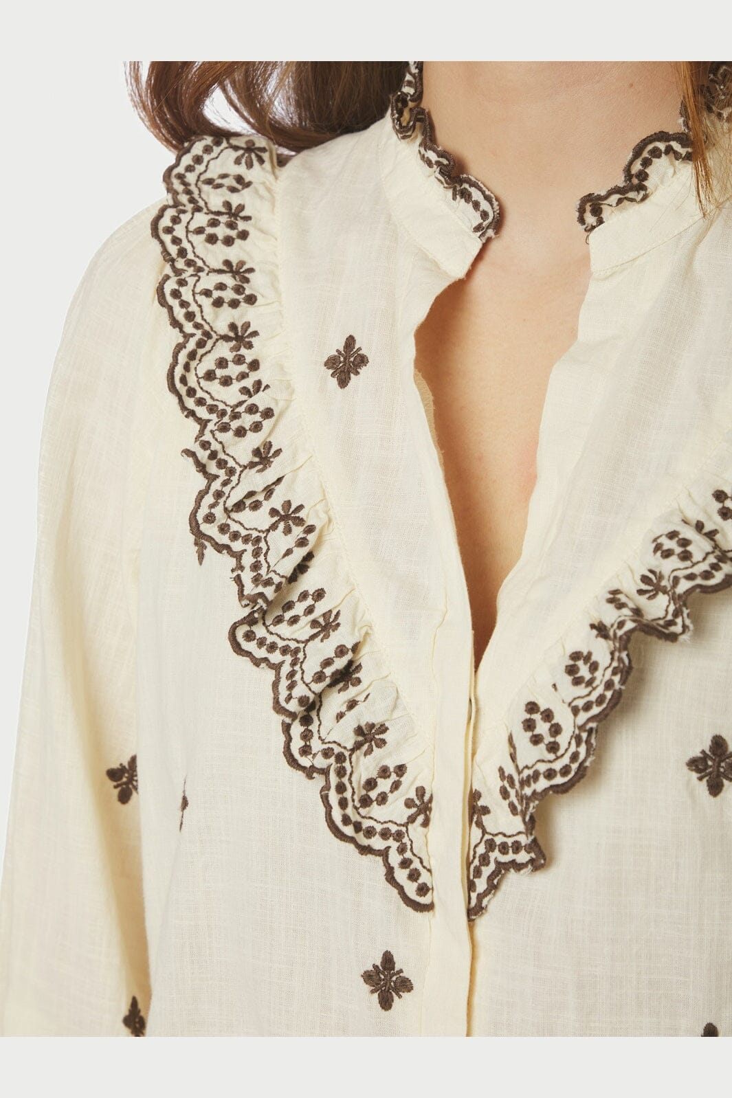 Bluse fra Neo Noir i lys gul bomuld med brune broderede blomster og blondebånd langs V-halsen og manchetterne.
