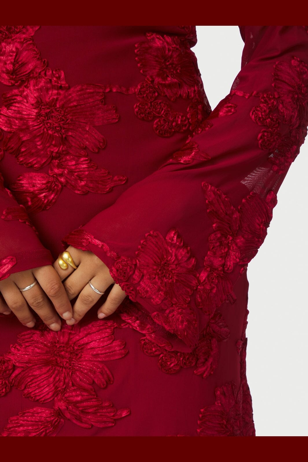 Rød meshkjole fra Neo Noir med store blomster i broderet mønster. Kjolen har en A-formet silhuet og lange ærmer med rund hals. Det fine meshstof har et dekorativt blomstermønster i burgundynuancer.