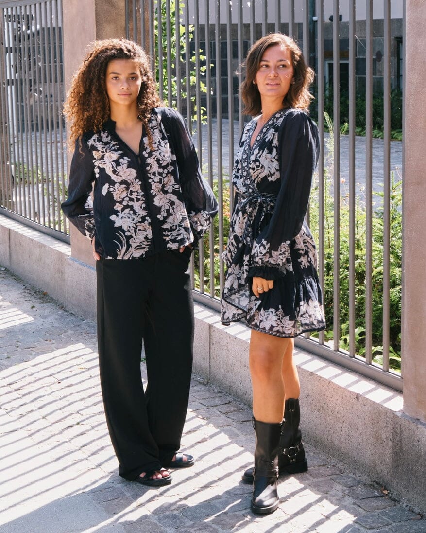 Mørkeblå slå-om-kjole fra Neo Noir med hvidt blomsterprint. Kjolen har V-udskæring, lange pufærmer og flæsekanter. Bindebåndet i taljen giver mulighed for at tilpasse pasformen.