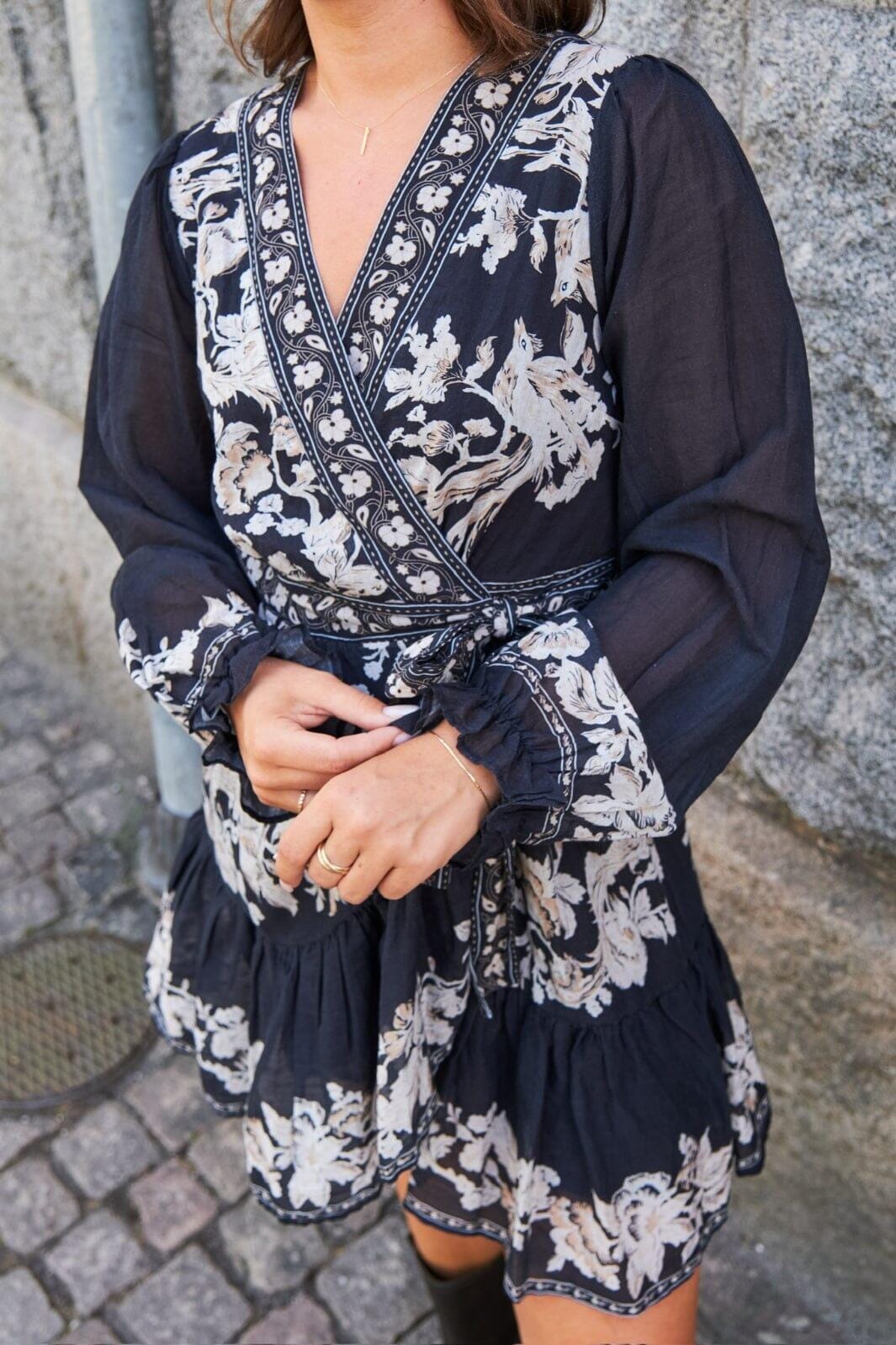 Mørkeblå slå-om-kjole fra Neo Noir med hvidt blomsterprint. Kjolen har V-udskæring, lange pufærmer og flæsekanter. Bindebåndet i taljen giver mulighed for at tilpasse pasformen.